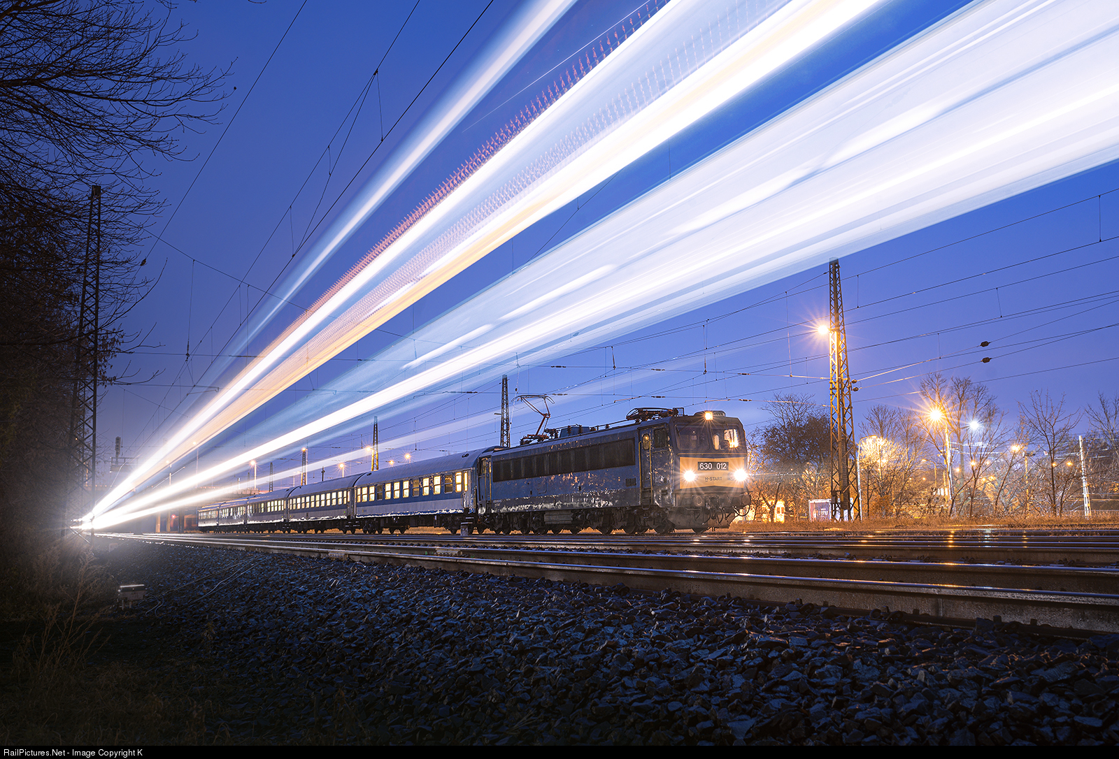 | Cold, wind and drizzle: many downsides of late fall, but making it an advantage: wet floor means nice contrast, November means early blue hour. While Budapest's Western station is under renovation rapid trains bound for Nyíregyháza terminate at Rákosrendező and passengers need to get off one stop earlier in Zugló. 630 012 with it's short set is shown waiting at Városliget (City park) junction for departure as a new double decker EMU makes a pass. |
