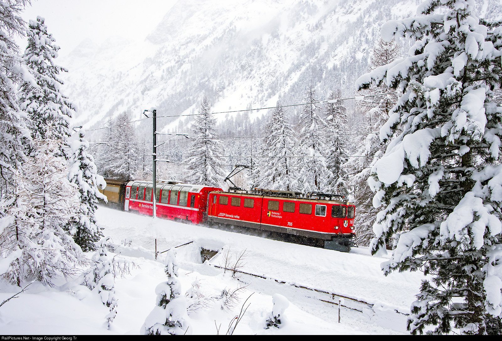 | Maybe it will be the last winter for the "sevenhundreds"....The Rhaetian Railway has planned to withdrawn the Ge 6/6 II series in the next year. # 701 is already parked. # 705 "Pontresina/Puntraschigna", delivered on may 5th, 1965, is pulling the freight train 5135 from Landquart over the Albula line to Pontresina through the deep snow in the Val Bever. |