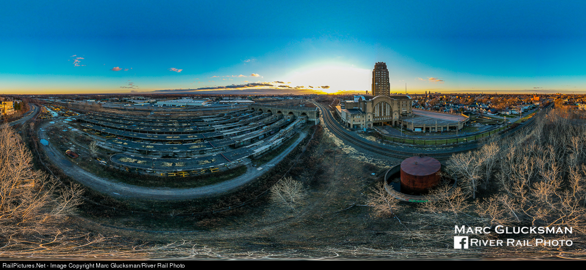 The Road To A More Certain Future. The history of New York Central's Buffalo Central Terminal did not begin in 1929, but that is when the station finally opened after many years of negotiation. From the time of the departure of the last Amtrak train in 1979, it had gone through a period of extreme decline before local citizens stepped in to prevent its total destruction. Windows have been replaced, electricity restored, and during normal times public tours are regularly offered. On the evening of December 7, 2020, the wide view at the hour of sunset shows the platforms to the left, the station building to the right, and the Belt Line running through the middle.