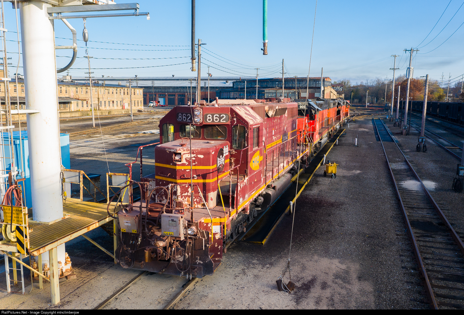 | Four of the five "Bessemer" locomotives that are still on the CN owned line sit under the sanding tower outside the shop complex in Greenville, Pennsylvania. In the lead is SD38 862, which wear DMIR paint patched for the Bessemer. This unit has typically been assigned as the dock switcher at the harbor in Conneaut, but would be brought to the shops for inspections and maintenance. |