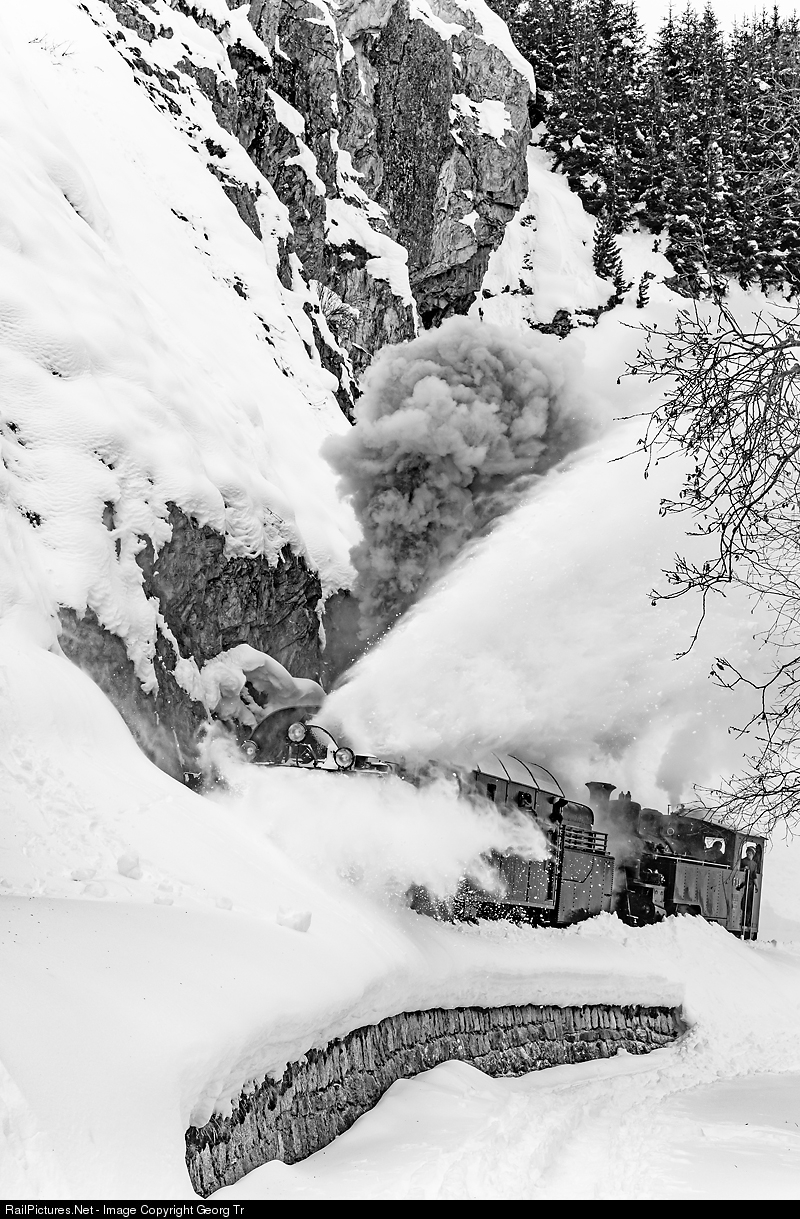 Snow fighting on the Dampfbahn Furka Bergstrecke in the gorge of the Furka reuss. Steam rotary snow blower R 12 (X rot d # 9212), built by the SLM Winterthur in 1913 for the Rhaetian Railway, main network. Withdrawn in 1968, given to the Blonay-Chamby Railroad Museum in 1971, then changed in 1996 with Dampfbahn Furka Bergstrecke: R 12 to the DFB, stabled in Gletsch, and the X rot d # 9214 of the DFB to the Blonay-Chamby. In 2002 transported from Gletsch to Goldau by road and since then renovated by the "R 12 group" of Martin Horath. Now operational again and the first day of blowing snow since about 60 years. Shoving is cogwheel steamlocomotive HG 3/4 # 4 of the DFB, built in 1913 as well.