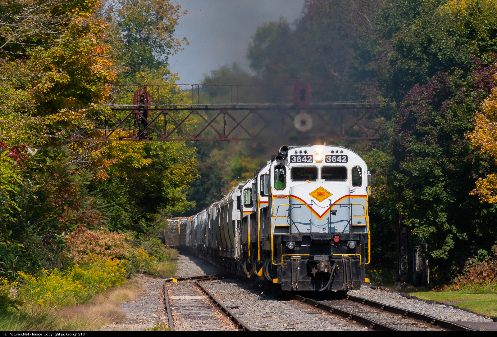 Delaware Lackawanna train PO-74 works hard upgrade as it passes under the former DLW signal bridge in Moscow, PA with a trio of six-axle ALCos for power.