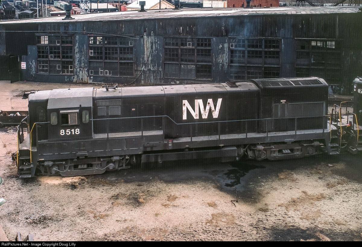 Norfolk & Western U30B 8518 idles on a turntable track nest to the three-stall roundhouse in the Baltimore & Ohio yard in Connellsville, Pennsylvania. The N&W bought 110 of 295 total U30B’s produced all with high hoods.