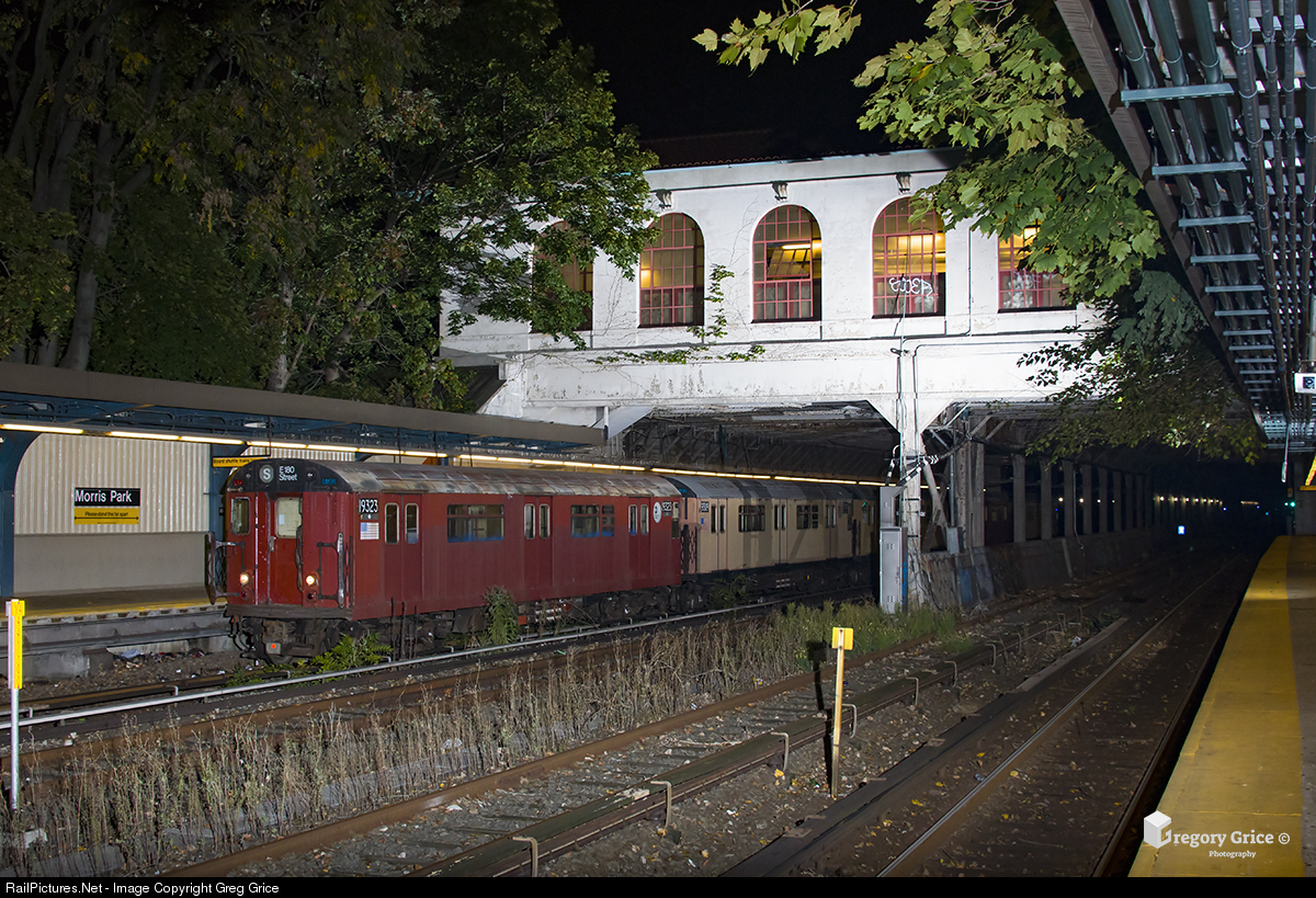 "Redbirds at Morris Park" New York City Transit's "Rail Adhesion Train", led by St. Louis Car Company R33 #9323, passes under the original New York Westchester & Boston Morris Park station house on the IRT Dyre Avenue Line. Morris Park was opened on May 29, 1912 and is the only station on the line listed under the National Register of Historic Places. Rail Adhesion Trains, also known as "Gel Trains", make one nightly round trip on select portions of specific New York City Transit subway lines applying a sandite solution to the rails to eliminate slip slide conditions during the leaf season. These trains usually consist of old subway cars that have been retired from revenue service and converted to work train duties. The Dyre Ave Gel Train is the A Division's only Rail Adhesion train; consisting of R33 "Redbird" cars and running on the original New York, Westchester & Boston Railroad right of way between East 180th Street and Dyre Avenue.