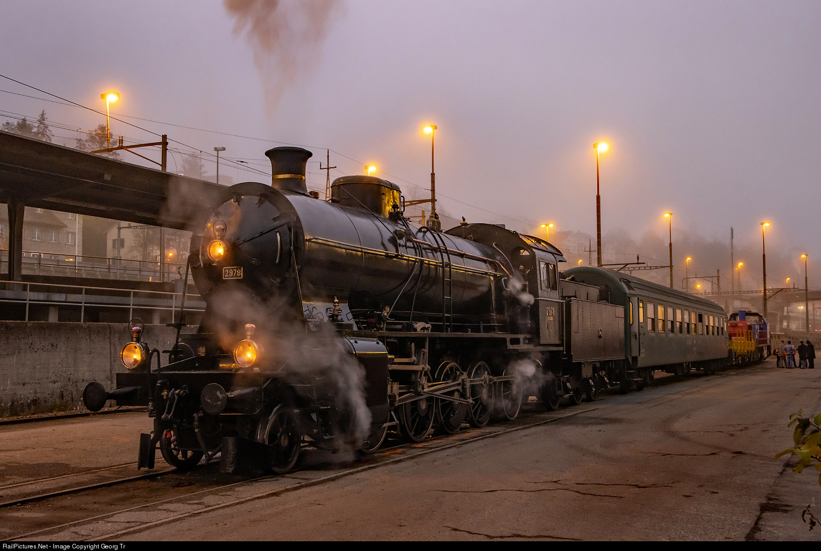 | The 2-10-0 freight train steamlocomotive C 5/6 # 2978 "Elephant" of SBB Historic is on the way from Brugg AG via Schaffhausen-Singen-Rottweil-Heilbronn-Würzburg to Meiningen, for a boiler repair (new tubes) in the Dampflokwerk Meiningen of the Deutsche Bahn. Taking water in Schaffhausen freight yard in the early morning. The locomotive was pulled by diesellocomotive Am 843 # 095 of SBB Cargo througout. The passenger car is a Bcm "Couchette" (sleeper) car used by the staff. Behind the passenger car is a flat car with some material.