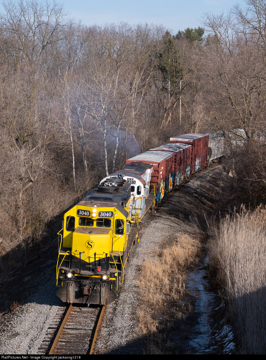 New York Susquehanna and Western train UT-1 heads south for Oneida Warehouse as it passes under highway 5 in Utica, NY. NYSW borrowed the MA&N ALCo on Monday 12/7 after 3040 suffered a mechanical failure on the line. Now 5 days later 3040 is back online, however, 2453 was still being used incase 3040 has any problems after the repair.