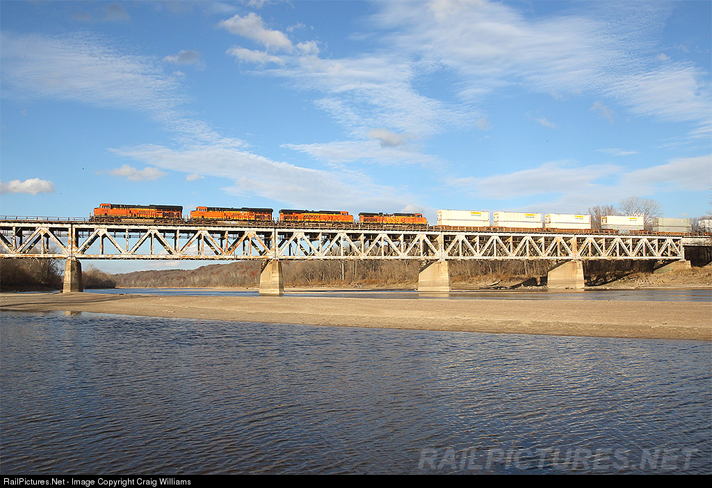 | Been to the Des Moines River Bridge a few times on the Marceline Sub. I was surprised how low the water was this trip! We were able to wonder out into the middle of the river, which meant the boys played in the water and I ducked clouds between trains as we enjoyed this unusual 70 degree November day. Here a San Bernardino Z-train rumbles across the bridge on its trek towards KC and the next crew change. The train is passing from Iowa into Missouri as it crossed the bridge. |
