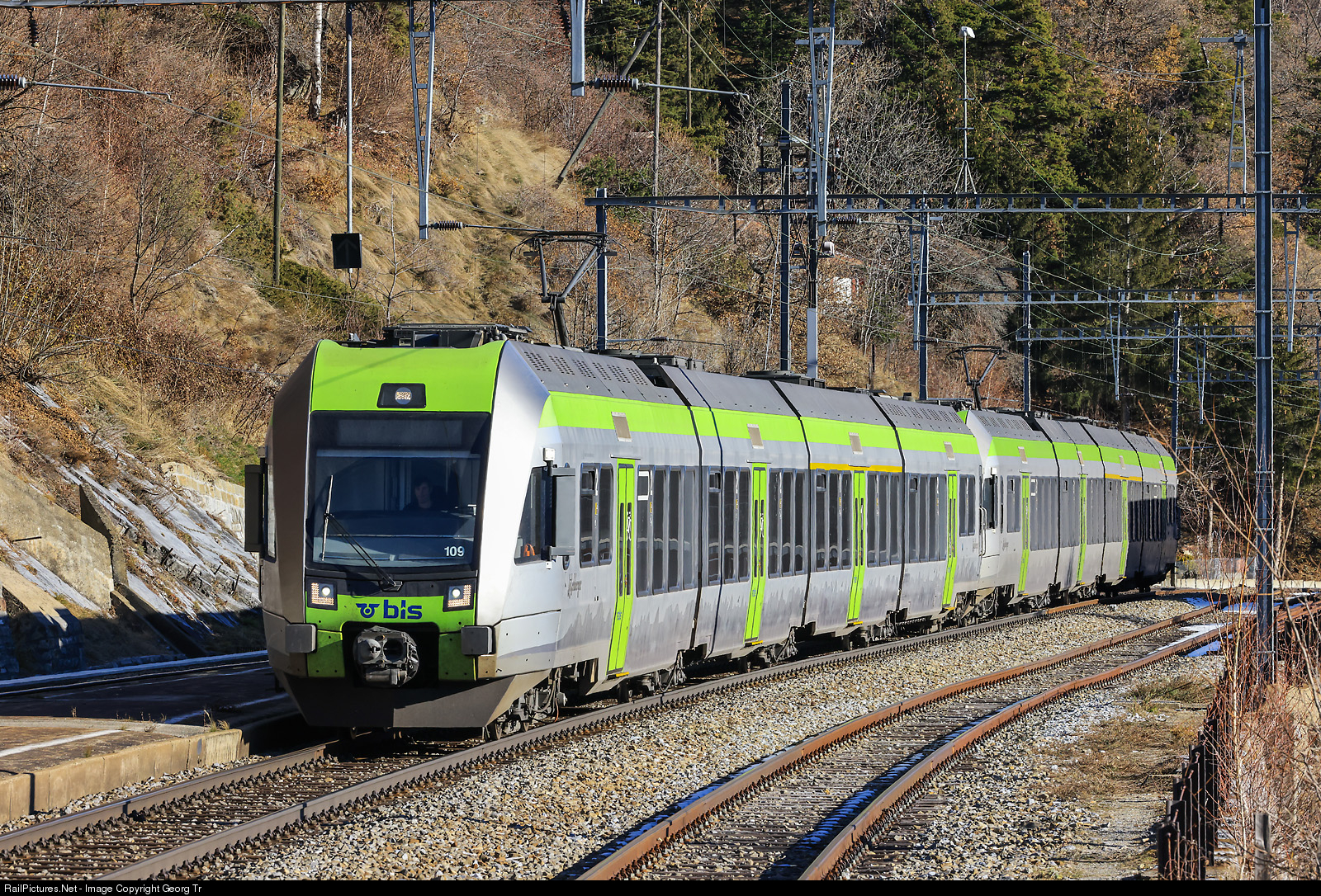 Two coupled "Lötschberger" trainsets of the BLS, with leading RABe 535 # 109, are entering Hohtenn on the Lötschberg mountain line, running the Regio Express 4272 from Brig via Goppenstein-Kandersteg-Frutigen to Spiez, then coupled with 2 other "Lötschberger" trainsets, as RE 4172 via Thun to Berne.