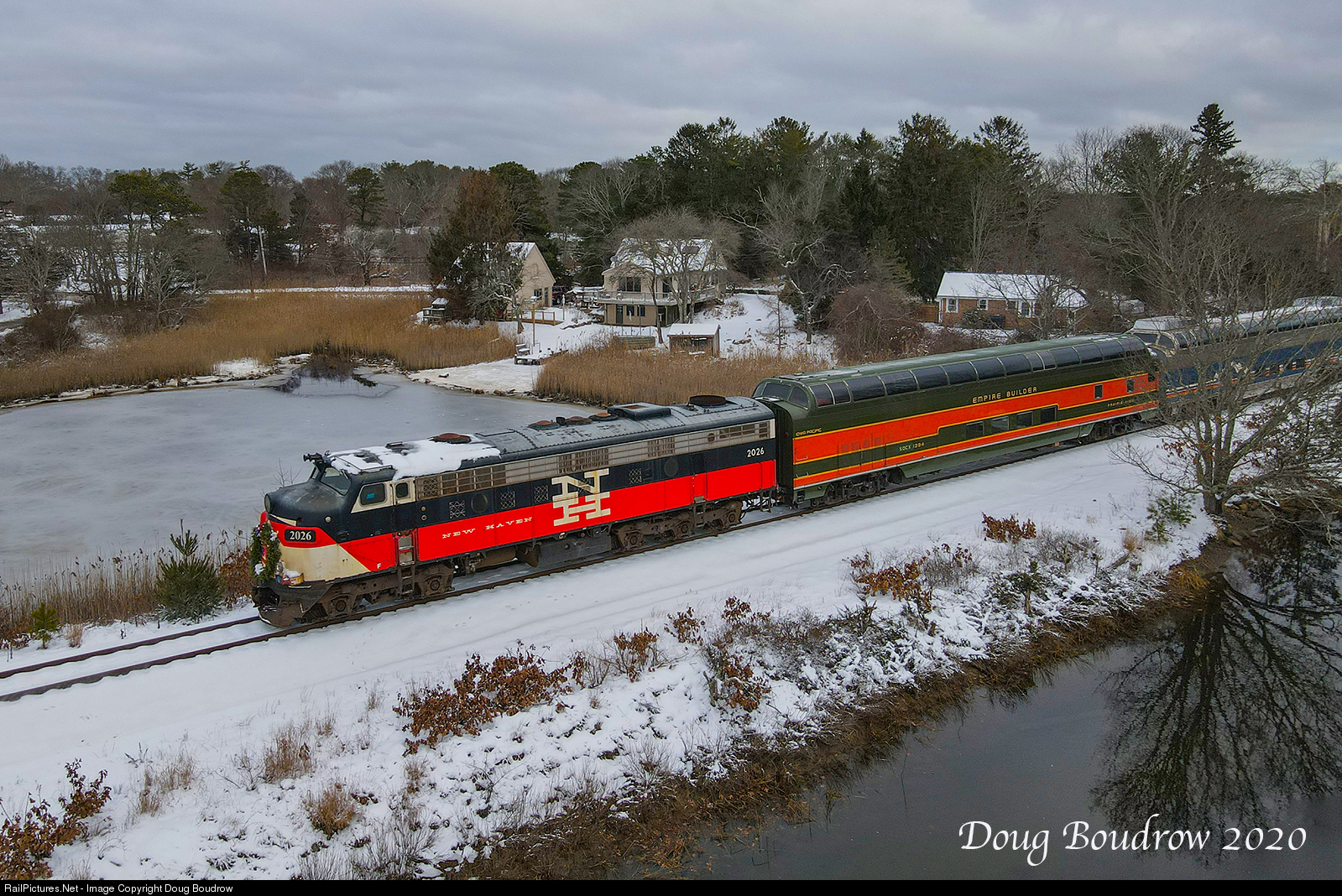 The Cape Cod Central Polar Express is seen deadheading to Onset passing Indian Neck in Wareham. Once in Onset, the train will be readied for the events of the afternoon and evening and Santa and the elves will board. Mass Coastal 2026, the trailing unit is an EMD FL9 built as New York New Haven & Hartford 2007 in 1956.