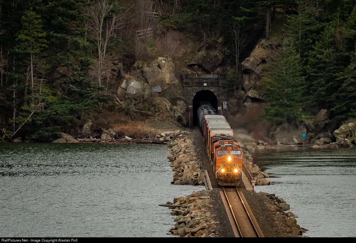 | BNSF 5033 leads a southbound Vancouver, BC to Vancouver, WA manifest out of Tunnel 21 in Bellingham, WA on December 20th, 2020. |
