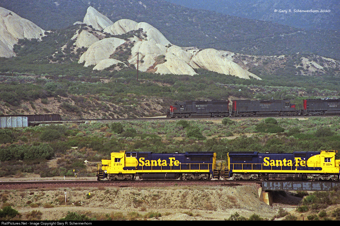 On a clear day at Cajon Pass a Santa Fe westbound intermodal with a trio of matched year old B40-8s(foreground), races a SP drag past the Mormon Rocks off the South Track.