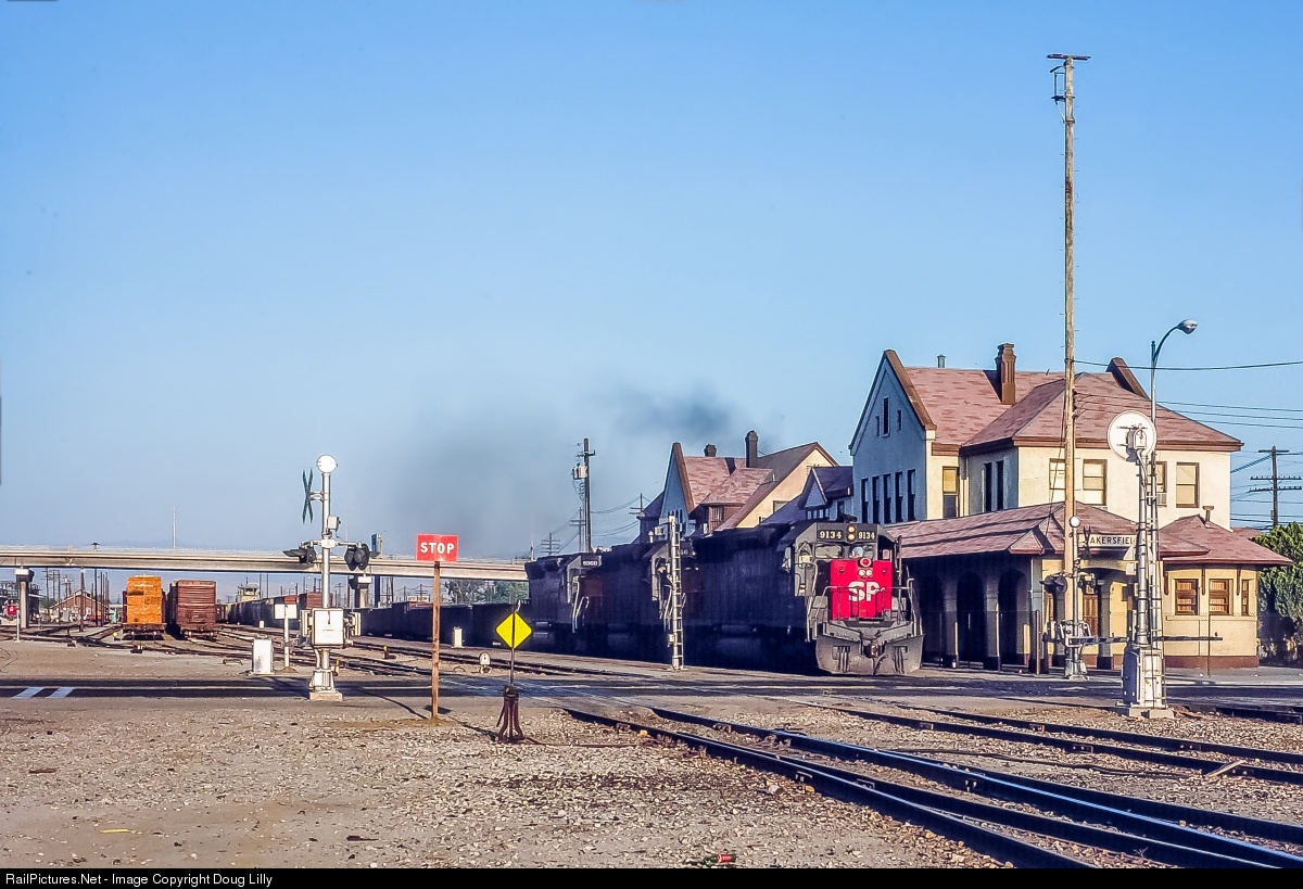 | Fresh off of a trip over Tehachapi, a westbound Southern Pacific manifest passes the station in Bakersfield, California. |