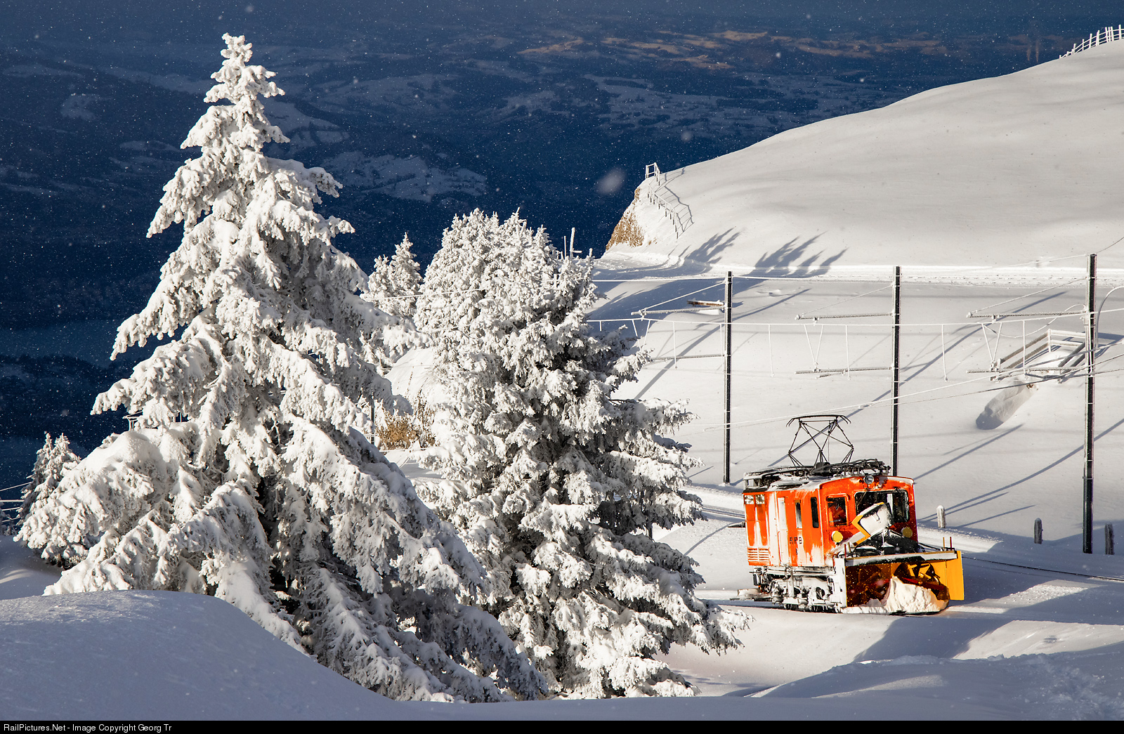 Shortly after 9 in the morning, the cogwheel snowblower locomotive He 2/3 # 8 of the Rigi Bahnen is running down below Rigi Kulm. This vehicle, built in 1930 by SLM and MFO for the Arth-Rig-Bahn (ARB) cleared the line from Arth Goldau in the morning before the first train. The day before (on Christmas day), there fell about 30 centimeter (12 inches) snow on the mountain.