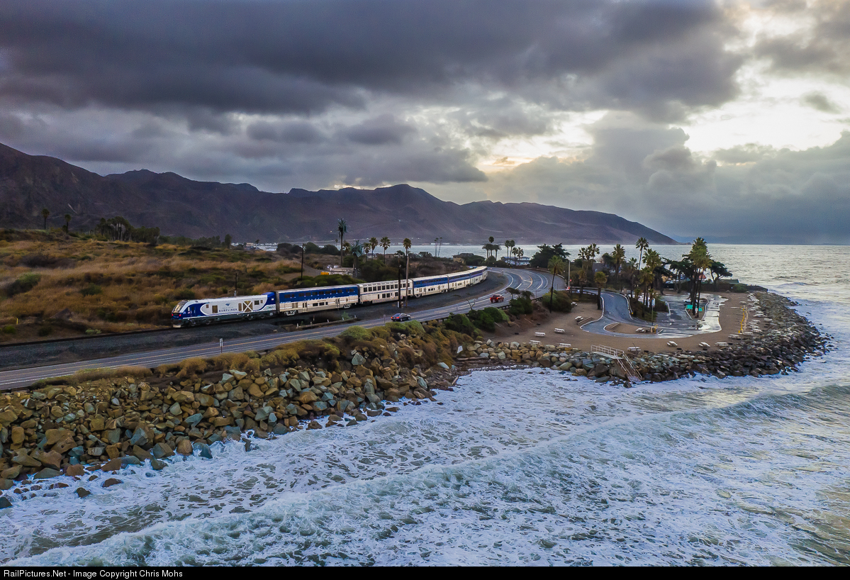 Sunrise on the Santa Barbara Subdivision with storm clouds rolling off the Pacific Ocean with much needed rain, and a high tide with waves pounding the coast. Pacific Surfliner No. 768 to los Angeles rounds the top of Pitas Point at an empty Faria Beach Campground closed to camping due to the new Covid spike. Lets be safe out there and hope for a Happy New Year.