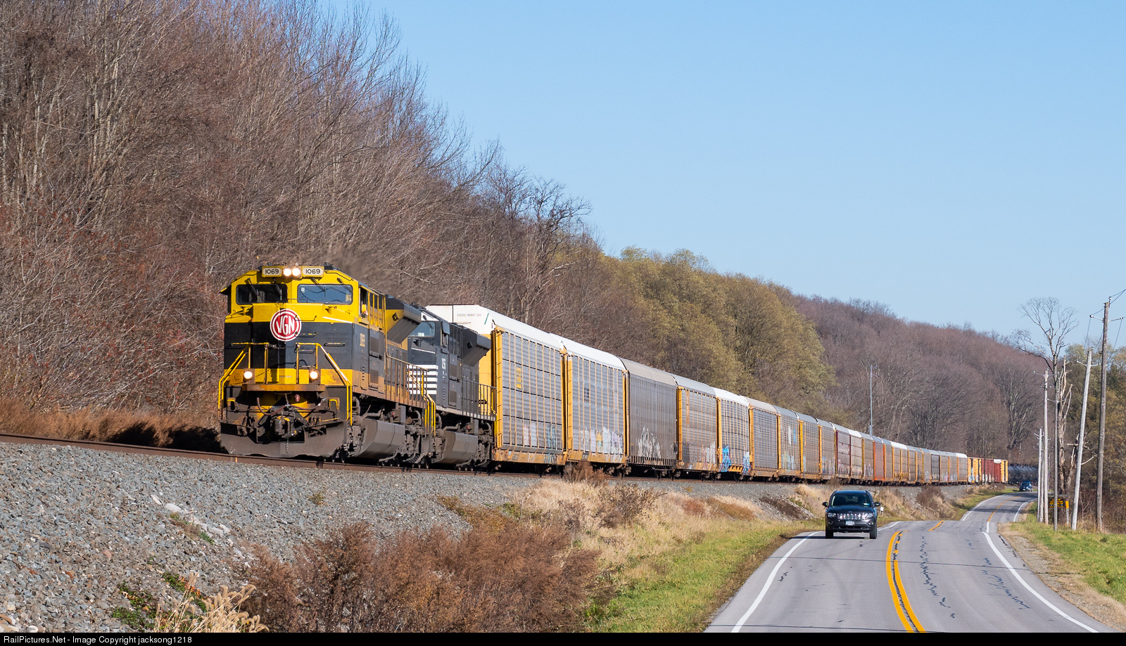 Norfolk & Southern train 310 (Elkhart, IN - Binghamton, NY) has EMD SD70ACe number 1069 "Virginian" heritage unit leading as it works its way east on the Southern Tier through Dale, NY.