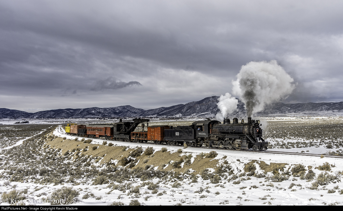 Call for the wrecking crew. With a derailment reported on the High Line to McGill, Nevada Northern's wreck train heads north out of Ely, across the Steptoe Fill to deal with the aftermath. Hauling the hook this day is the beefy Alco Consolidation #93. Immediately behind the locomotive, the red idler car is the crane's tool car, which carries all of the rigging equipment that is necessary to do any type of hoisting that might be required. Behind the tool car is the essential element of this train, a 100-ton, steam-powered crane that is still fully operational. Behind that are an outfit car, a hopper containing ballast, a box car with tools and supplies, and a Kennecott Caboose.