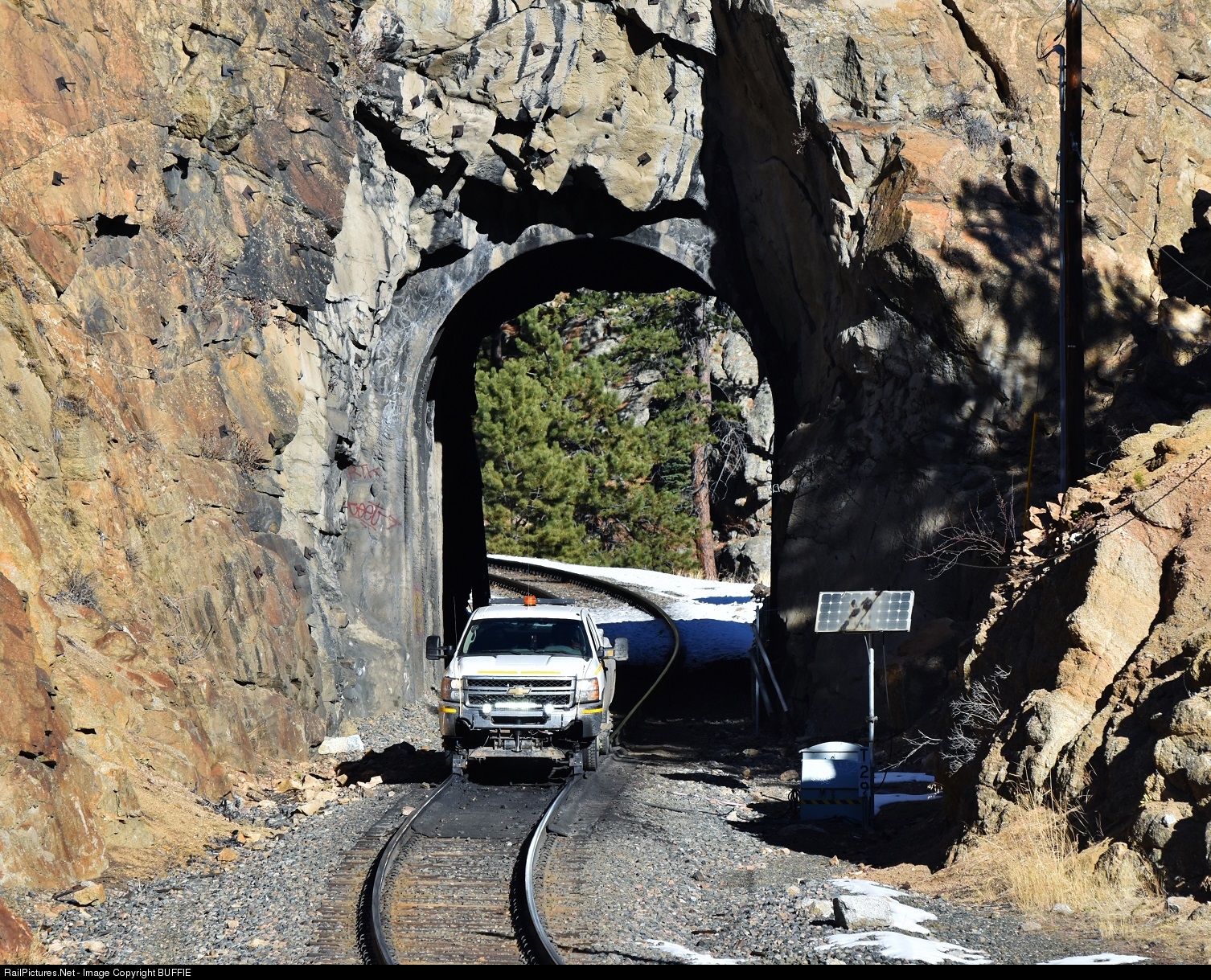 A Union Pacific high rail track inspection vehicle inspects Tunnel # 29 in Pinecliffe, Colorado and will work its way down to Tunnel #1 at Plainview. It is critical to inspect the tunnels and track as the recent snow and freezing temperatures, followed by temps in the 50's or 60's, can cause rock falls or other debris that might block the track.
