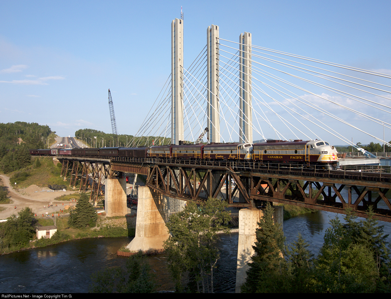 A quartet of F's lead the eastbound "Canada 150" train across the Nipigon River. The new four-lane suspension bridge for the Trans-Canada highway is still under construction in the background.