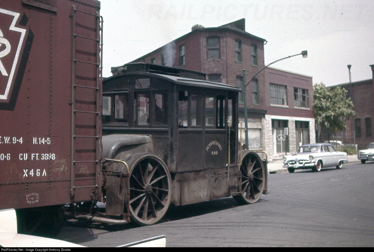 Near PRR's Bayview Yard, an unusual electric tractor is seen switching cars down Monument Street. This tractor was built at the Pennsy's Altoona Works, and was specifically designed to move freight cars through the tight street trackage of the city.