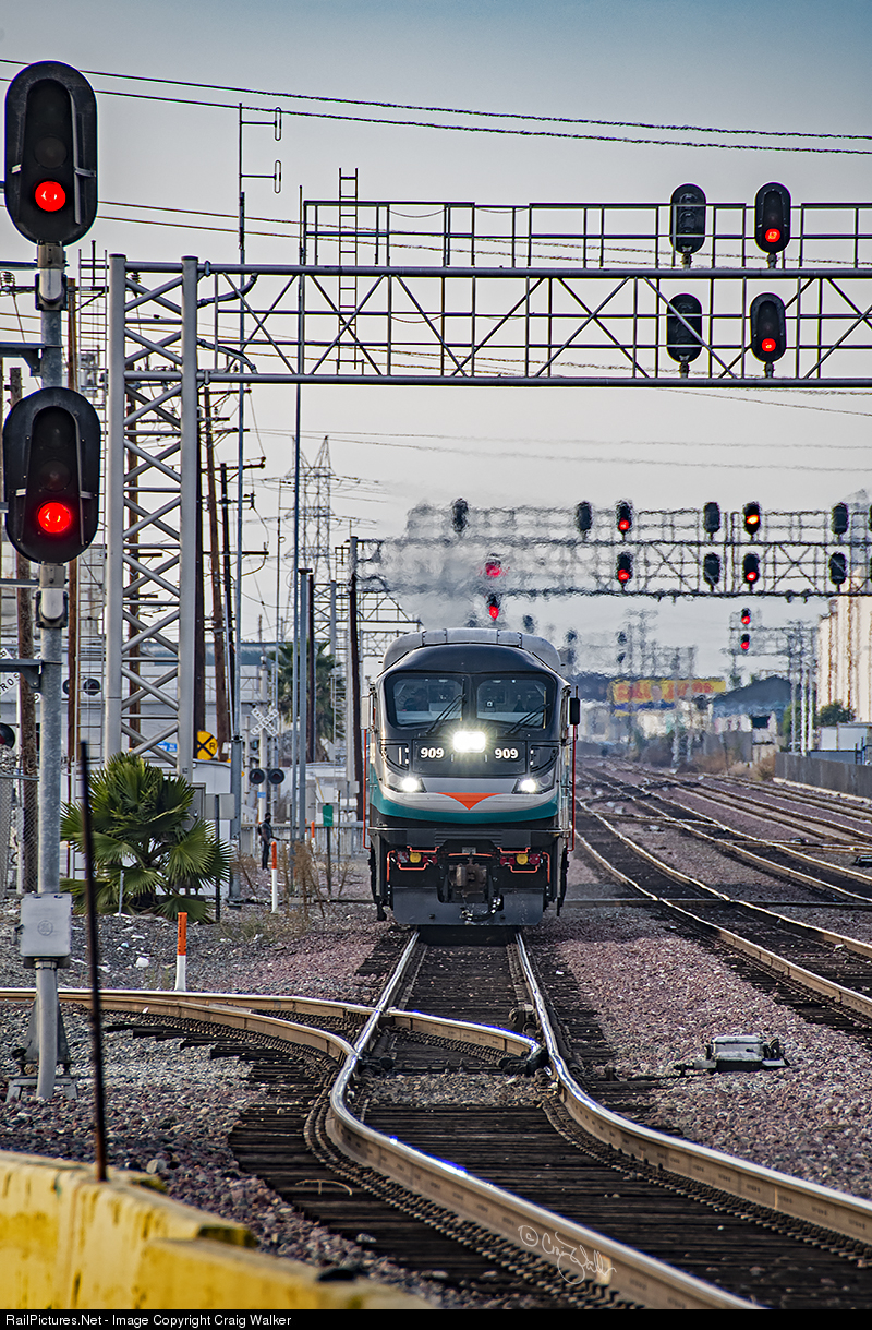 Soto, on BNSF Railway’s San Bernardino Sub, is the junction with Metrolink’s River Subdivision, West Bank Line. Metrolink train 752, a weekend service train originating in Los Angeles’ Union Station about eight miles to the north and heading to Perris, in Riverside County, is stopped waiting for permission to operate on the BNSF. SCAX F125 909, built by EMD in December 2016, is in charge of train 752 this day. (Vernon, California – January 2, 2021)
