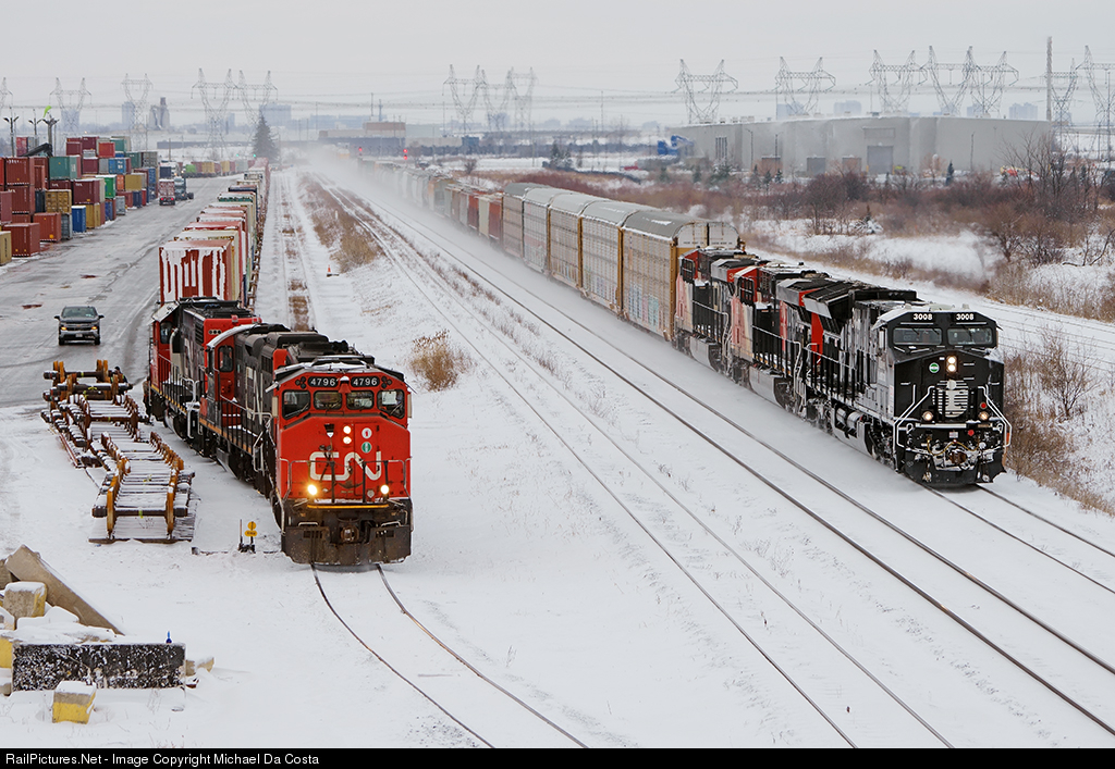 A meet! CN 384 with the IC heritage leader rolls past the south end BIT yard job which had finished spotting a track at Malport before they head back to BIT.