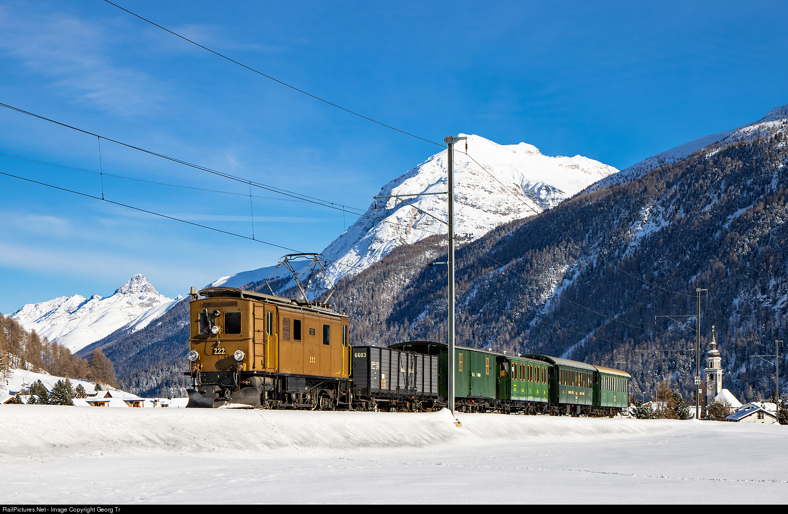 | Ge 2/4 # 222 of the Rhaetian Railway, built in 1913 by SLM and BBC as # 204 for the new electrified line from Bever to Scuol-Tarasp, is on a driver training run from Samedan to Spinas, and just left Bever. In the background left is Piz d'Esan. The locomotive was rebuilt in 1946 with a more powerful electromotor and is historic vehicle nowadays. |