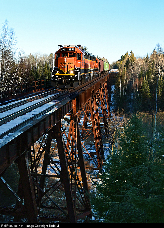 | Returning after serving the Minorca mine with fresh bentonite loads, BNSF 2957 and crew bring 5 empties back with them shown crossing an impressive steel trestle along the former Missabe (now CN) Keenan Sub as they head into the sun on the way back to their own yard at Kelly Lake. |