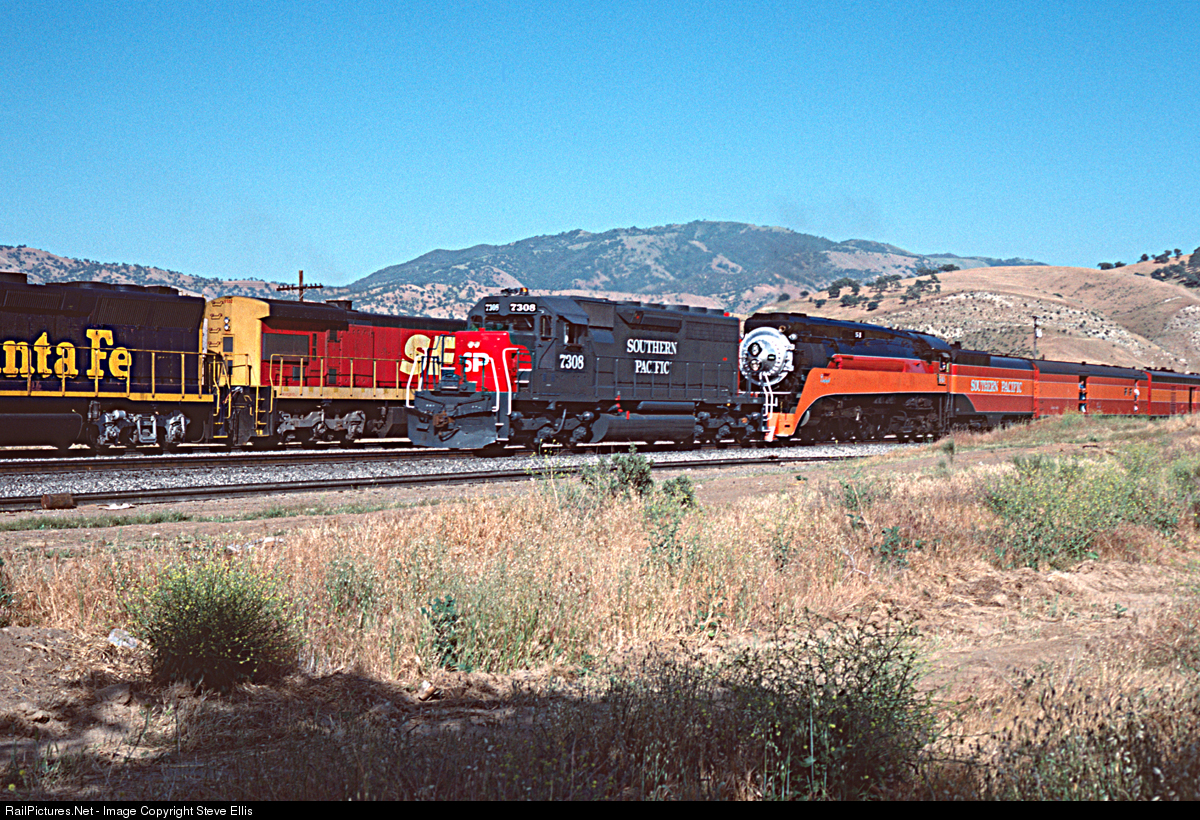 No one was happy, when a freshly shopped SP 7308 was added to the front end of the 4449 Daylight for its trip over Tehachapi. There were a lot of angry railfan's that day. But looking at the picture today there is so much history in it. The 4449 lives on, but who know if it will ever get to Southern California again. The ugly diesel that ruined our shot. Not sure if it's got the scrapers torch yet, probably. The Southern Pacific is gone, The Santa Fe is gone. The red and yellow paint scheme gone, SF30C now scraped. It all changes so fast. Yet the steamer is still going.