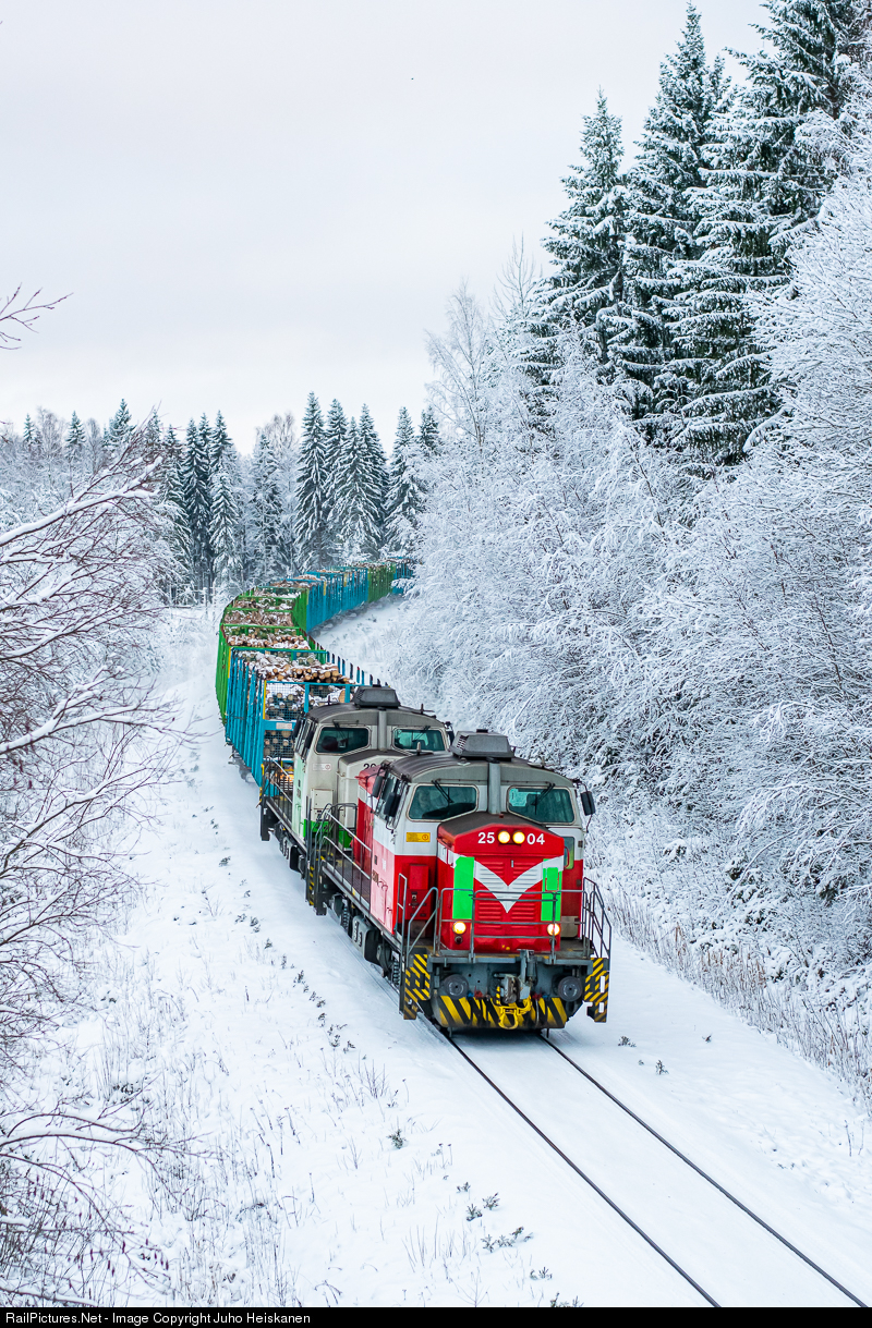 | Timber train T 4227 slows down before Varkaus in the beautiful snowy Finnish scenery. The destination of the train is Stora Enso's Kommila pulp mill in Varkaus. The train is led by two Dv12 diesel-hydraulic locomotives. |