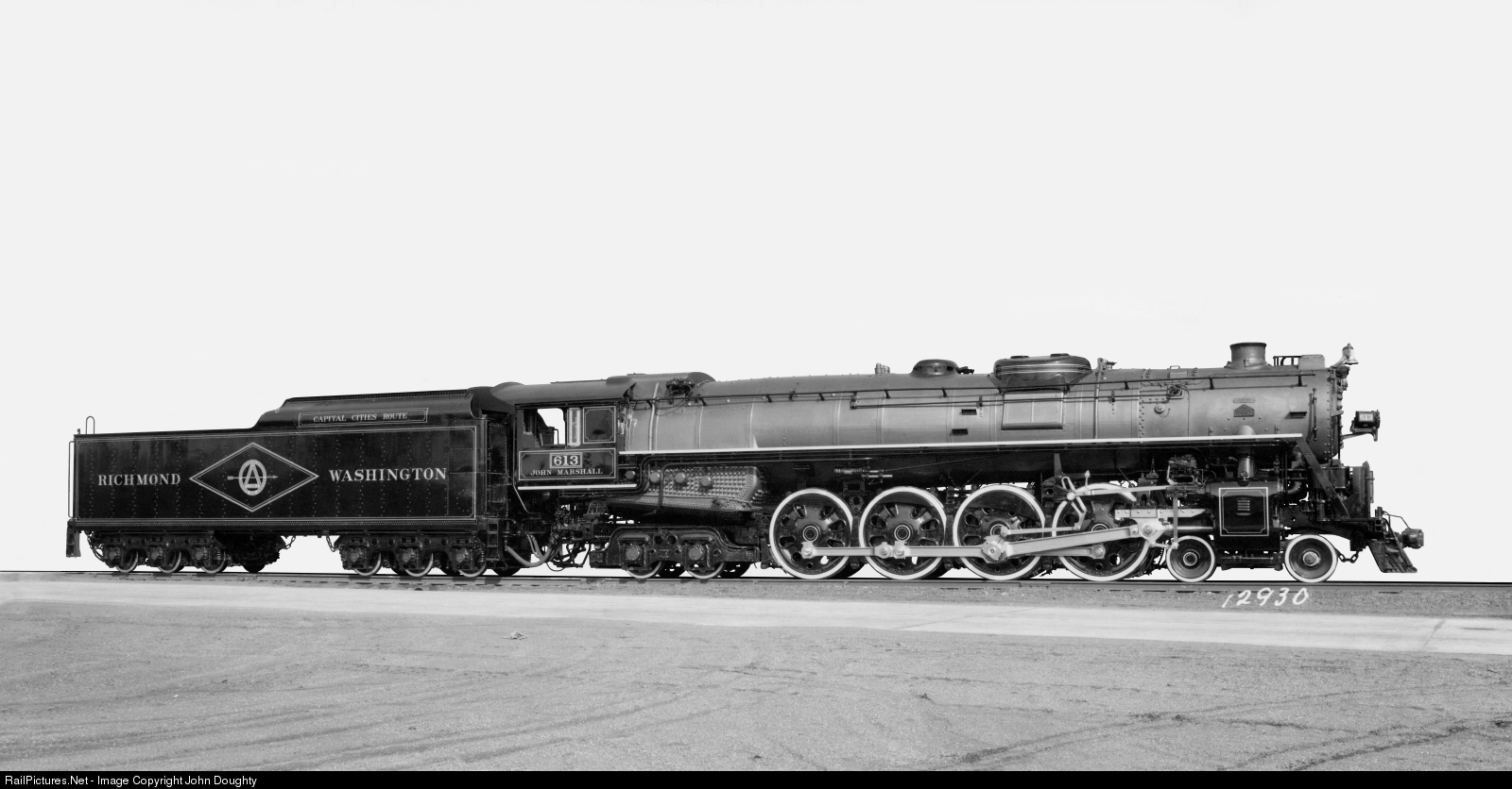 This beautiful 4-8-4 Northern was built by the Baldwin Locomotive Works for the Richmond, Fredericksburg & Potomac Railway. It is the John Marshall. It had a tractive force of 62,800 lbs., and a combined engine and tender weight of 724,400 lbs. My great, great uncle Robert F. McKee, Sr., was a design engineer at Baldwin Locomotive Works. This Baldwin Locomotive Works builders photo card is from the John R. Doughty collection.