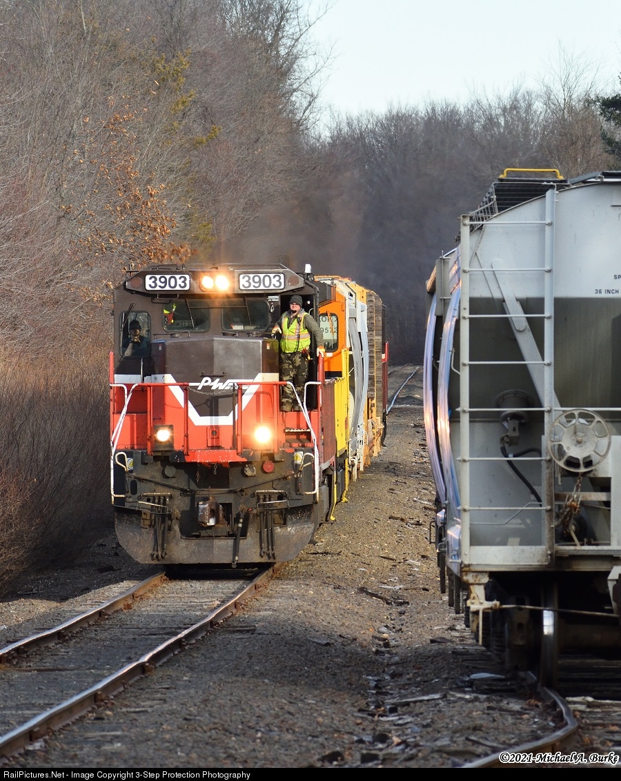 | The sun briefly comes out from behind the clouds, as Providence & Worcester CT-1 slows to let the conductor off at Tilcon’s Reeds Gap siding. The crew will make a quick switching move to pick up two covered hoppers and then continue south for Cedar Hill. |