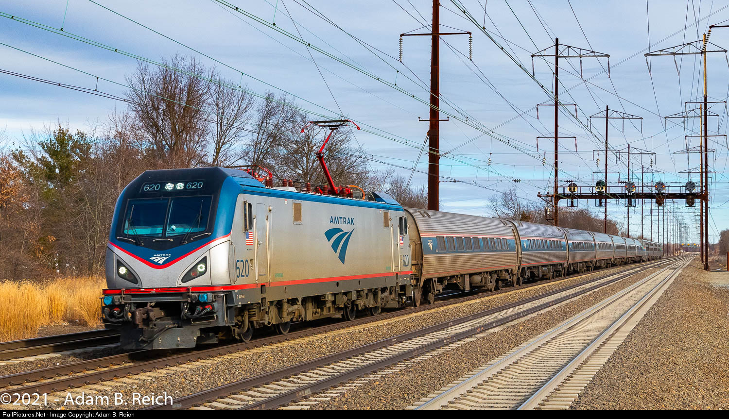 Big Star at Edison: Amtrak's Silver Star, Train #91, is seen passing through Edison, NJ on Saturday, January 9, 2021. Since only one of the two Silver Service trains currently operates each day and coaches do not run at full capacity due to the COVID-19 pandemic, Train #91 is carrying additional coaches for now.