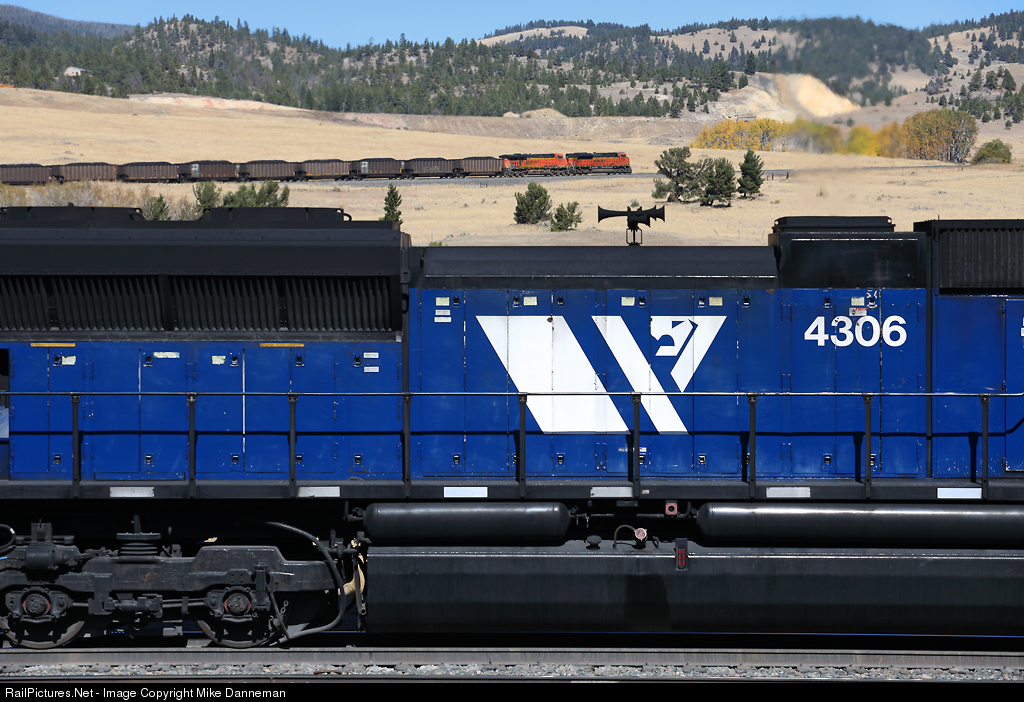 A westbound BNSF coal load climbs the 2.2% grade out of Austin, Montana, on the the serpentine route over Mullan Pass on October 7, 2020. The head end is working toward the loop around Iron Ridge, while down below, one of four MRL SD70ACe locomotives in a manned helper set cut in mid-train, grinds away toward the west switch of Austin. Two more BNSF GEs are pushing on the rear as DPUs. Above the grove of yellow trees is Iron Ridge Cut, a portion of the west portal of bypassed Iron Ridge Tunnel, and a third level of track climbing toward Weed. The show up Mullan Pass is still a good one.