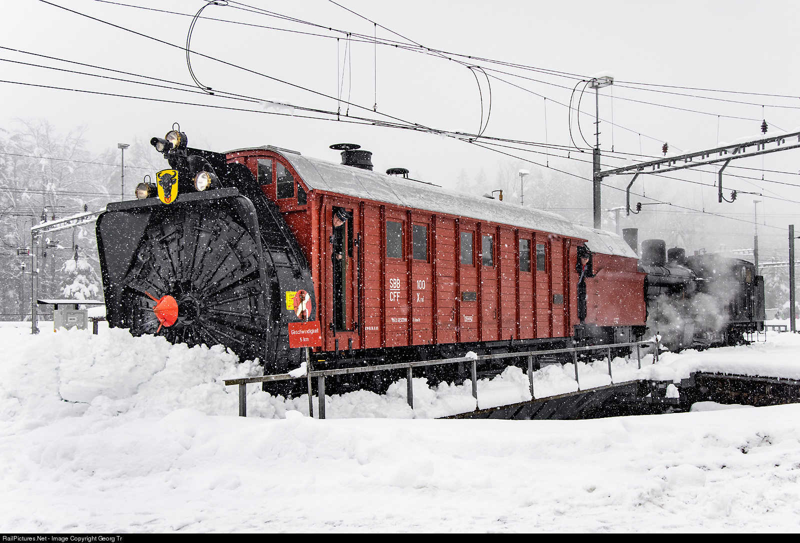 2-6-2 T steamlocomotive Eb 3/5 # 5819 of SBB Historic is shoving the steam rotary snow blower Xrot # 100 in Arth Goldau on this real winter day. The "Rotary" was built in 1896 by Henschel/Cassel/Germany for the Gotthardbahn (Gotthard Railway). Exactly 125 years ago, on january 17th in 1896, this snow blower, which was called "Rotary", was delivered in Rotkreuz station and then brought to Erstfeld. The Xrot # 100 is part of SBB Historic and was exhibited in the Swiss Museum of Transport in Lucerne since 1982, but it had been moved to the Arth Goldau depot for space reasons. In the moment, it is not operational.