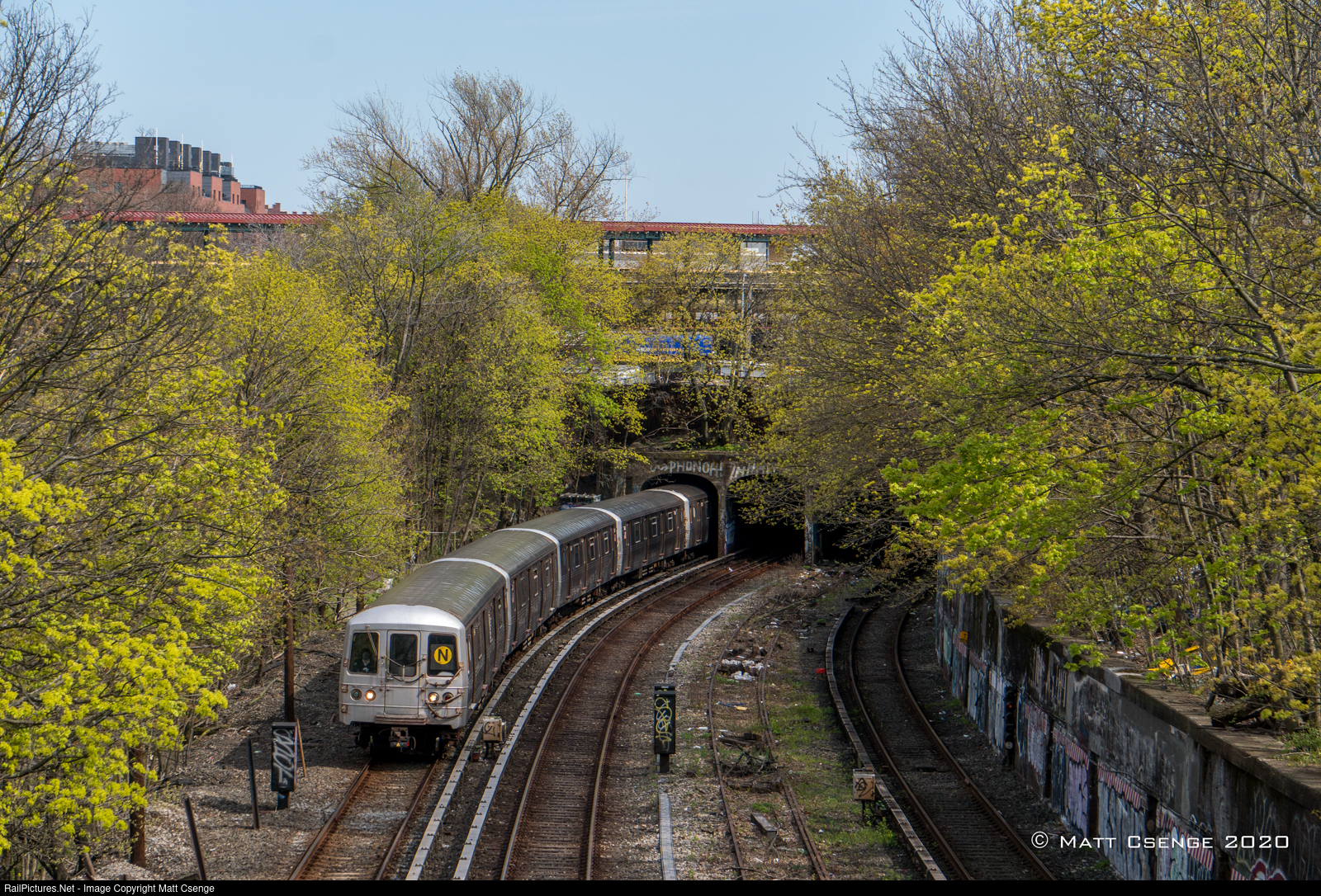 A Manhattan-bound N train pops out of the tunnel under 14th St and New Utrecht Ave, surrounded by fresh green leaves on the trees along the line. The 62nd St Station on the West End Line is visible above.