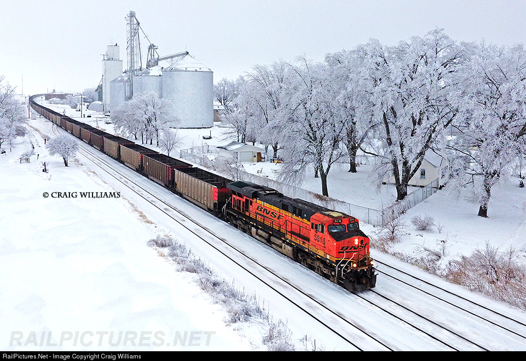 An empty hopper works west thru the frozen tundra on the Ottumwa Sub. The train is seen here passing thru the small town of New London about 14 miles west of Burlington. The train is working towards the next crew change point at Creston, IA, 148 miles ahead. This empty came off the INRD at Newton, IL, and came back to the BNSF at Centralia via the CN.