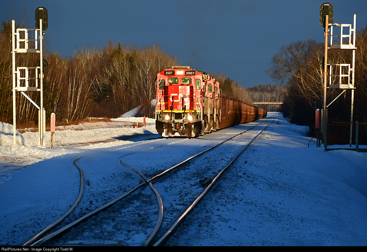 | As the clouds moved in it was a lucky break to have a sliver of full sun between late afternoon shadows and clouds taking over to catch this northbound empty train coming off the running track after meeting loads then having to clear the switch of snow before it would line for their movement to continue on. |