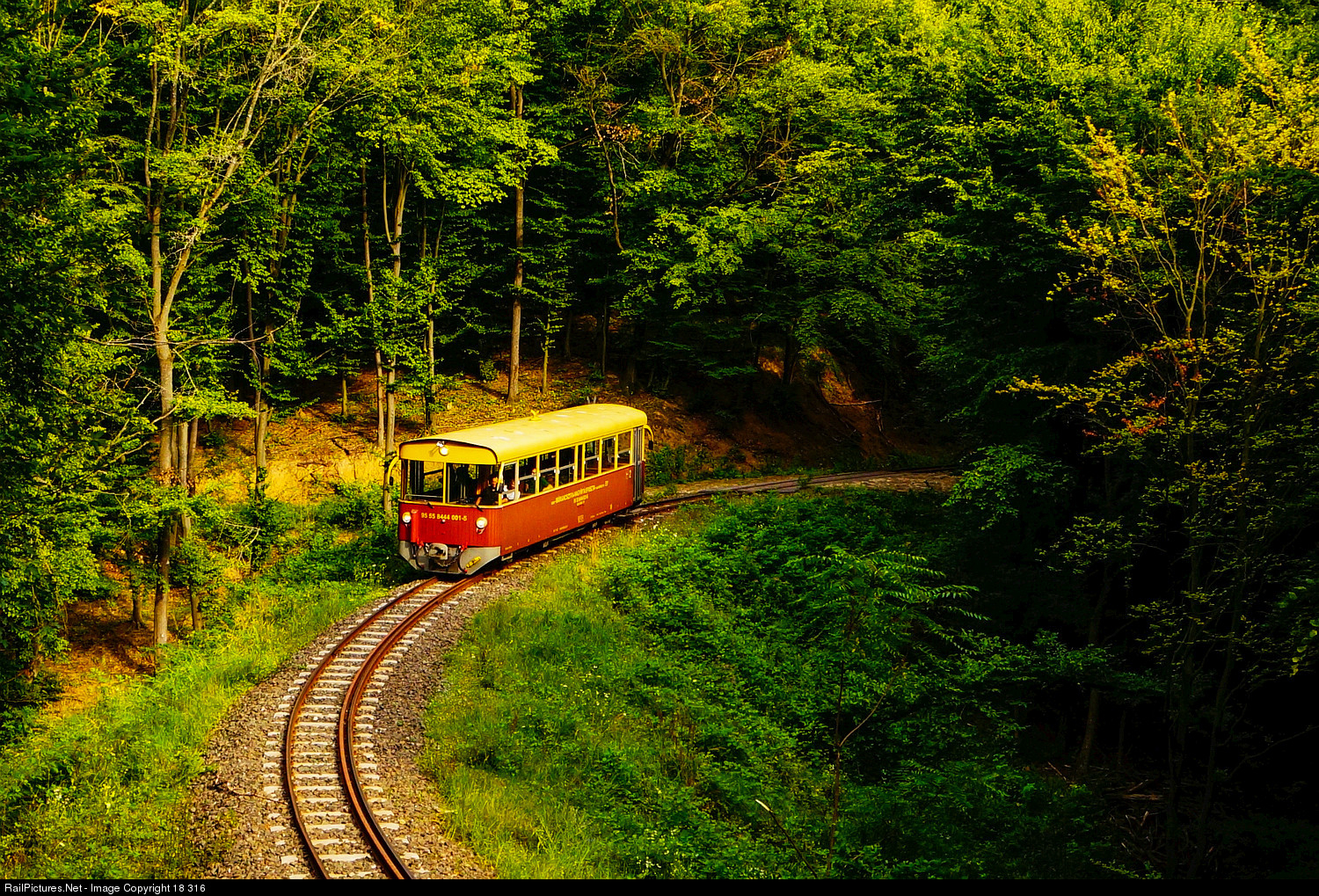 Running the last train service of the day from Szob to the summit at Nagyirtáspuszta, a 760-mm-gauge diesel rail bus (nicknamed "Tóbi 2" [Toby 2] by its manufacturer, the central workshop for three forestry railways in the Börzsöny mountains) nears Vetettfű halt, in a forest showing autumn colours early due to a heatwave. This line was born a century ago, when the forestry railway near the village of Nagybörzsöny was cut off from its mainline connection by border changes, so it was connected to another narrow-gauge railway (serving quarries in a neighbouring valley) through a mountain pass, with several switchbacks and loops. The network was closed in stages until the 1990s, but locals never gave up on re-opening the entire mainline as a tourist railway, which could be completed with EU funds by 2016. Since then, weekend trains on this section are operated by Bezina-völgyi Erdei Vasút (BvEV), one of two companies operating on either side of the mountain pass, but the rail bus got a livery with the aspirational name of the Szob-Márianosztra-Nagyirtáspuszta-Nagybörzsöny Forest Railway (SzMNNEV), the intended merged company that never came.