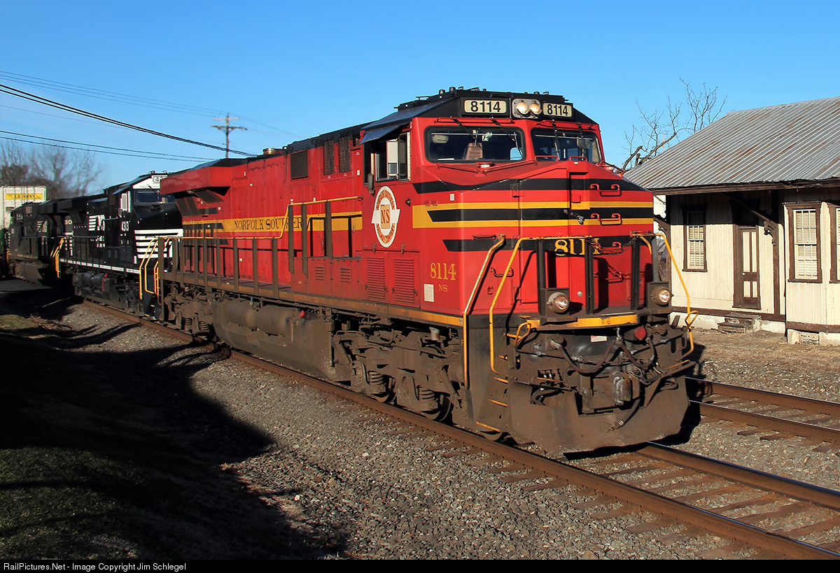 The NS 8114 , Norfolk Southern Heritage unit passes the abandoned Reading Railroad Mertztown Station in Mertztown with the Train Symbol NS212 doing track speed of 60MPH.