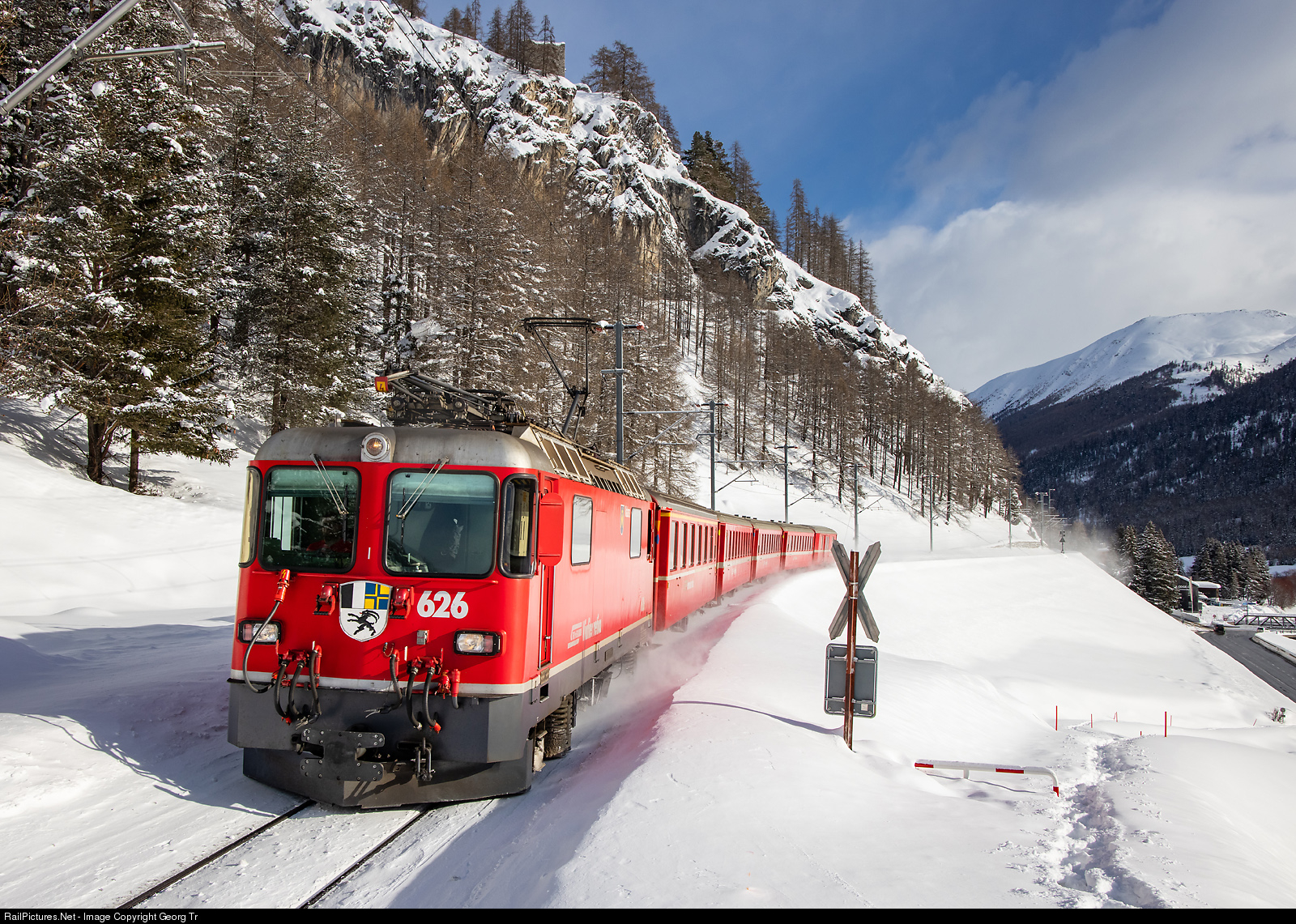 | Ge 4/4 II # 626 of the Rhaetian Railway is pulling the Regio Express 1327 from Landquart via Klosters-Zernez-Samedan to St.Moritz, between Madulain and La Punt-Chamues-ch. |