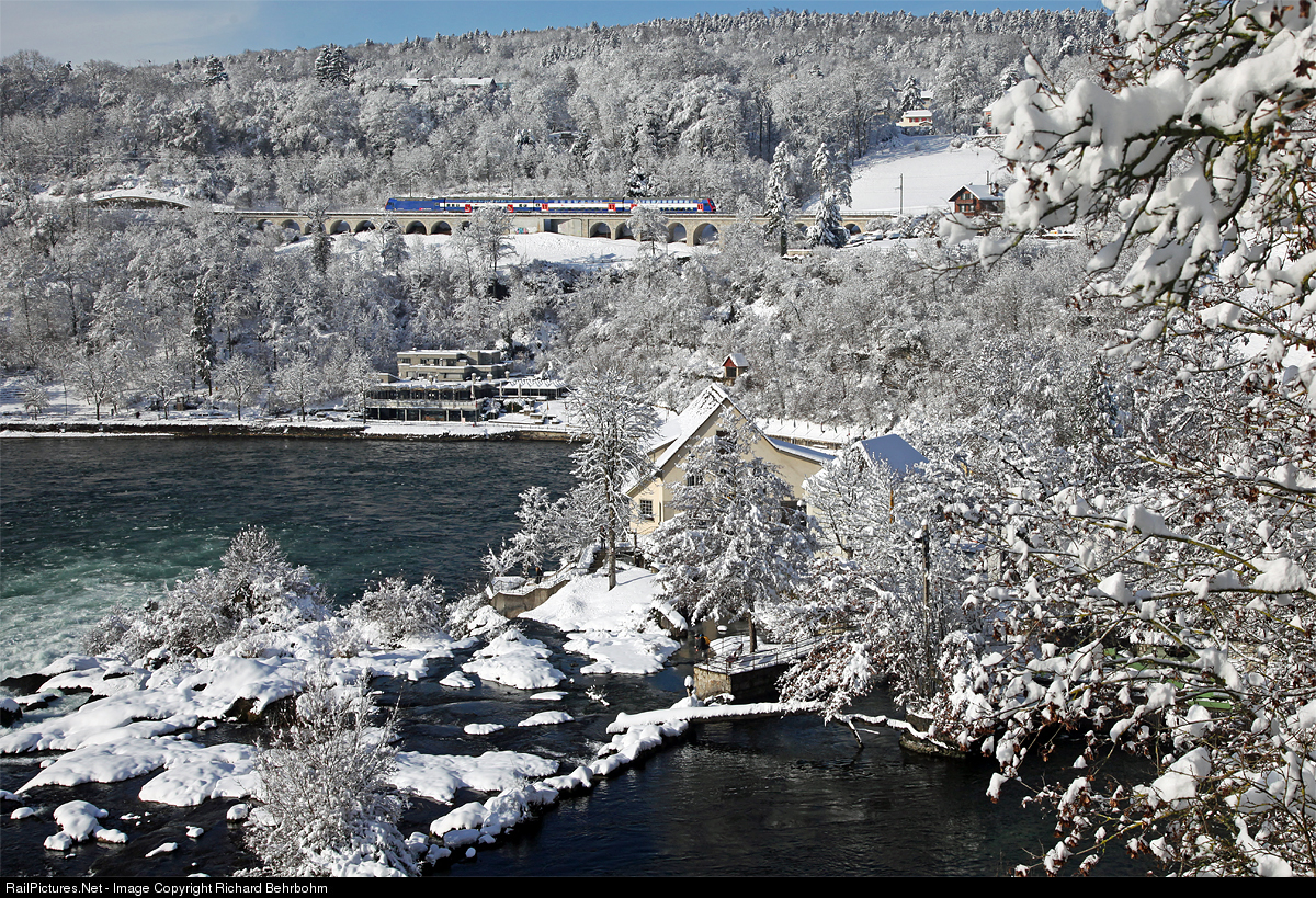 | A double deck commuter trainset (DPZ) in the S 9 service 18944 Uster - Schaffhausen is running above the Rhine Falls. |