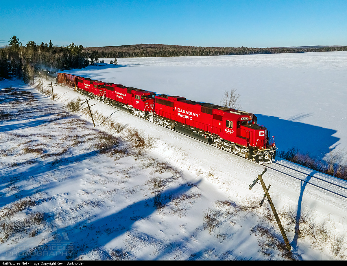 CP dispatched a nice trio of ex-Soo units, SD60 6232, and the SD60M duo of 6262 and 6258, on the Montreal, QC to Brownville Jct., ME train 250-29. Cruising eastbound on recently upgraded 40 mph trackage at Long Pond, Maine, the trio is handling 87 cars.