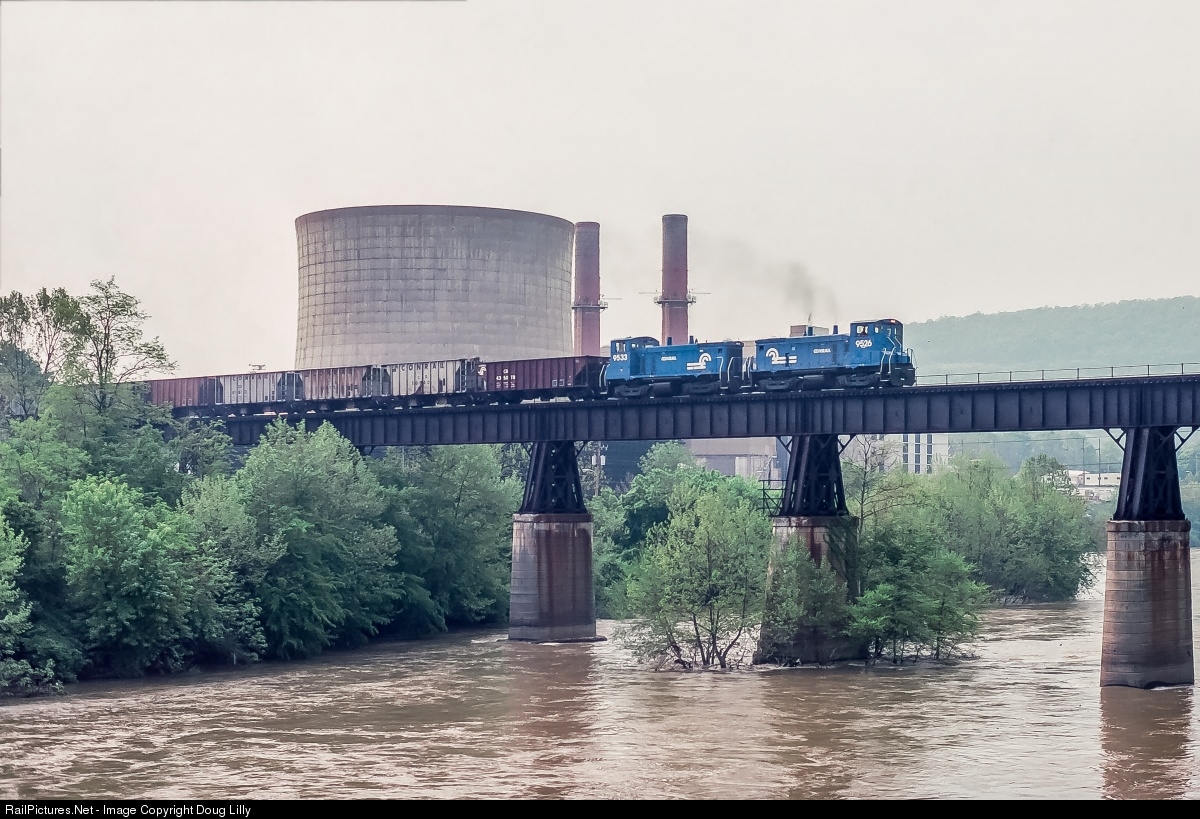 Led by nose-to-nose SW1500’s, Conrail local WHRE-99 crosses the rain-swollen Schuylkill River in the shadow of Metropolitan Edison’s Titus Generating Plant. WHRE-99 originated in Reading, and went east to Pottstown, where it served industries on the Pottstown Industrial Track. Between Reading and Pottstown, its two biggest customers were the Vulcan Materials and Pottstown Trap Rock stone quarries in Dyers and Stowe, respectively. As a result, ballast hoppers were frequently seen trailing the power.