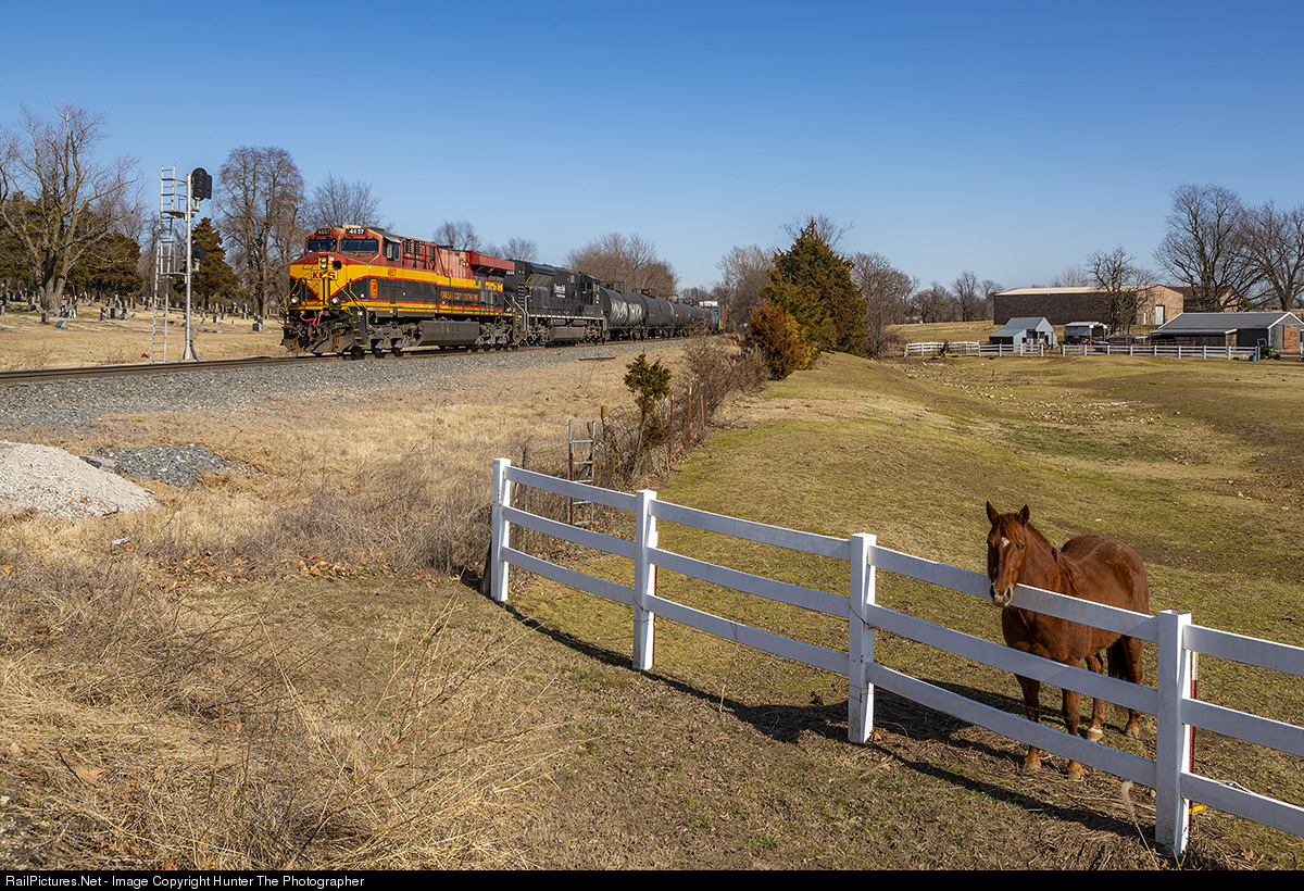A battered ES44AC leads a southbound manifest train by a horse pasture in Gentry, AR on a sunny February 1, 2021.