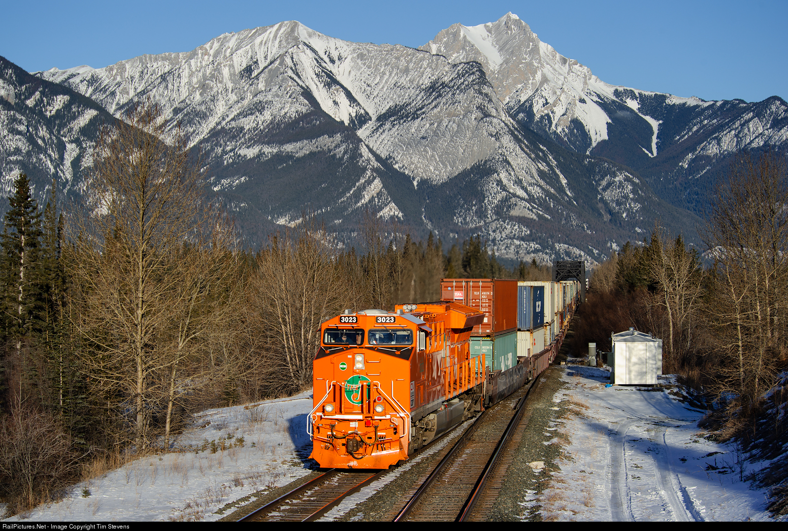 Brightly painted in EJE orange, CN ET44AC 3023 takes the north track at Henry House shortly after crossing the Snaring River bridge with train Q101 in tow.