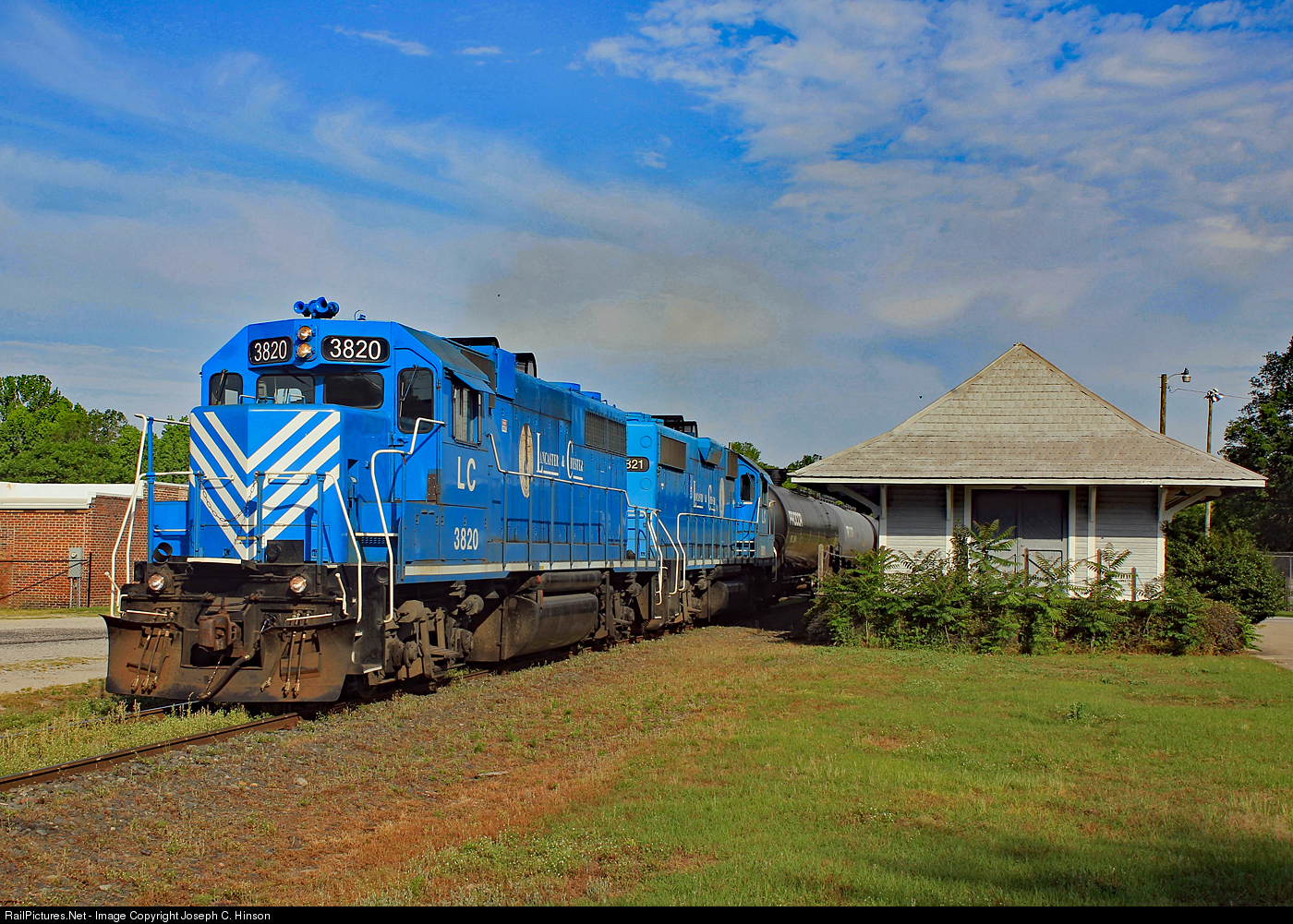 L&C GP38AC pulls to a stop beside the former Southern Railway depot in Heath Springs, South Carolina to spot some empties from Plains, LLC on a siding.