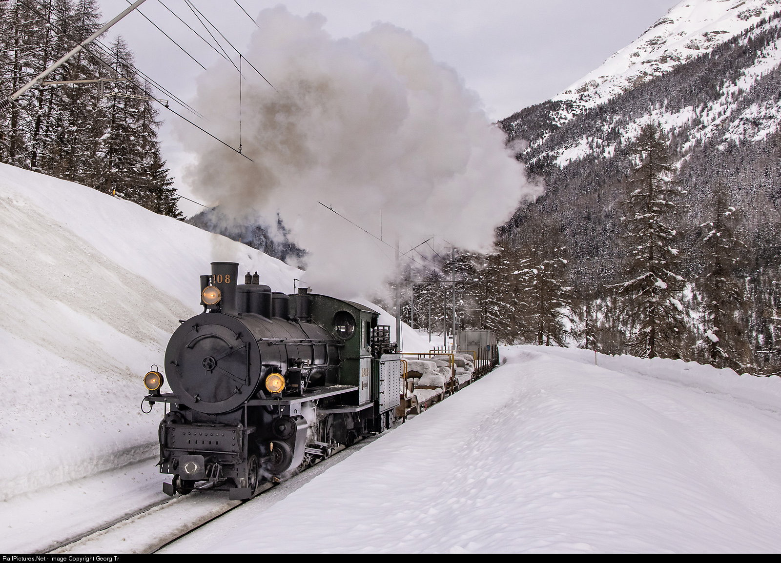 | After a short stop for control/greasing, the 2-8-0 "Consolidation" steamlocomotive G 4/5 # 108 "ENGIADINA" is leaving Cinuos-chel-Brail station with the freight train 9949 for engineer training purposes from Scuol-Tarasp to Samedan. The locomotive was built in 1906 by the SLM and is based in Samedan. This year, the well known traditional "Engadine Winter steam train" had to be canceled due to the Covid-19 crisis. |