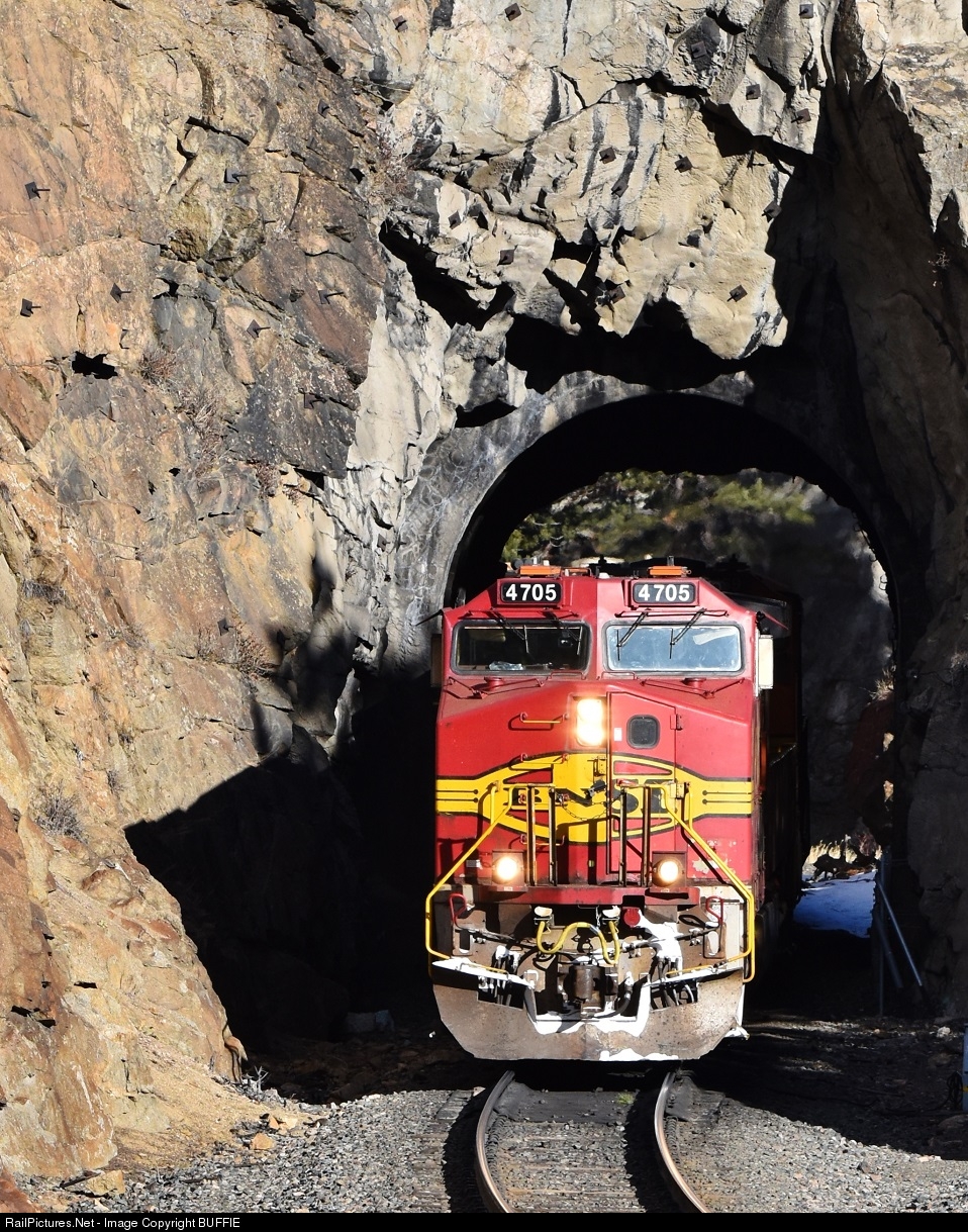 BNSF 4705 (Dash9) provides a rare opportunity to catch a Warbonnet on lead going through the Moffat Tunnel district. Here it emerges from Tunnel 29 at Pinecliffe, Colorado.