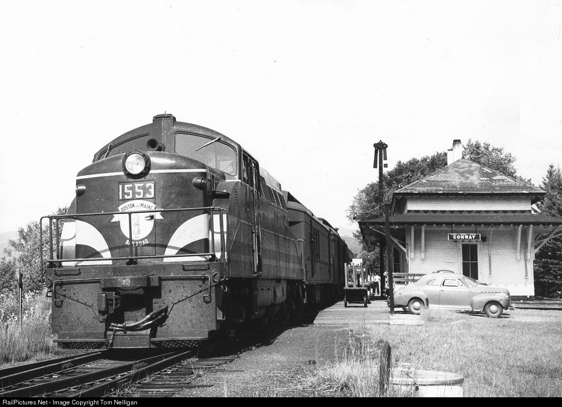 Roughly 70 years ago, one of the Boston & Maine's oddball EMD BL2s leads a North Conway (NH)-Boston branchline local into the station at Conway, NH. The BL2s are long gone but Conway still sees passenger trains as the southern terminal of the Conway Scenic Railroad. Photo from my collection, photographer unknown.
