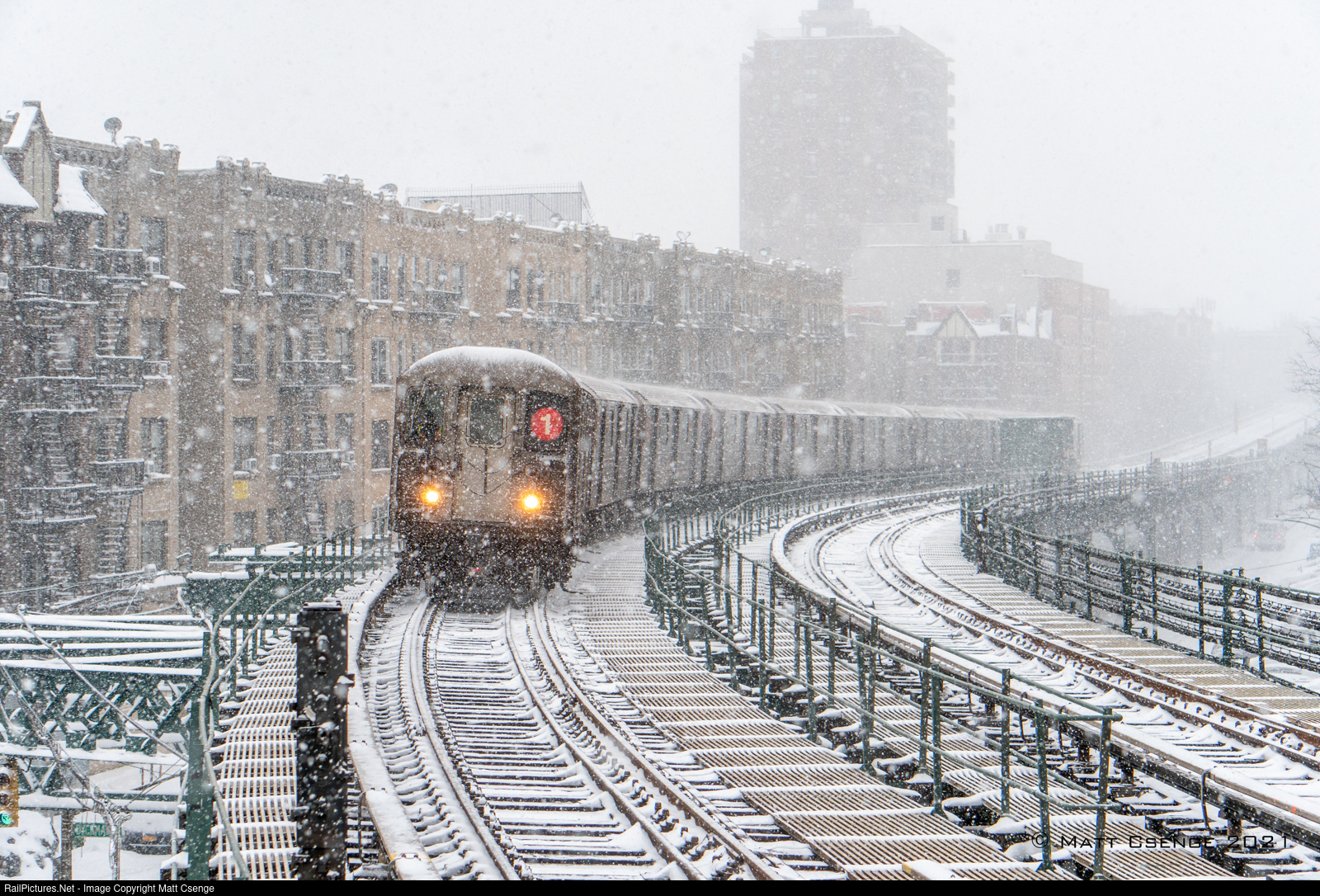 A South Ferry-bound 1 train approaches Dyckman St Station amidst some of the heavier snowfall from winter storm Olena.